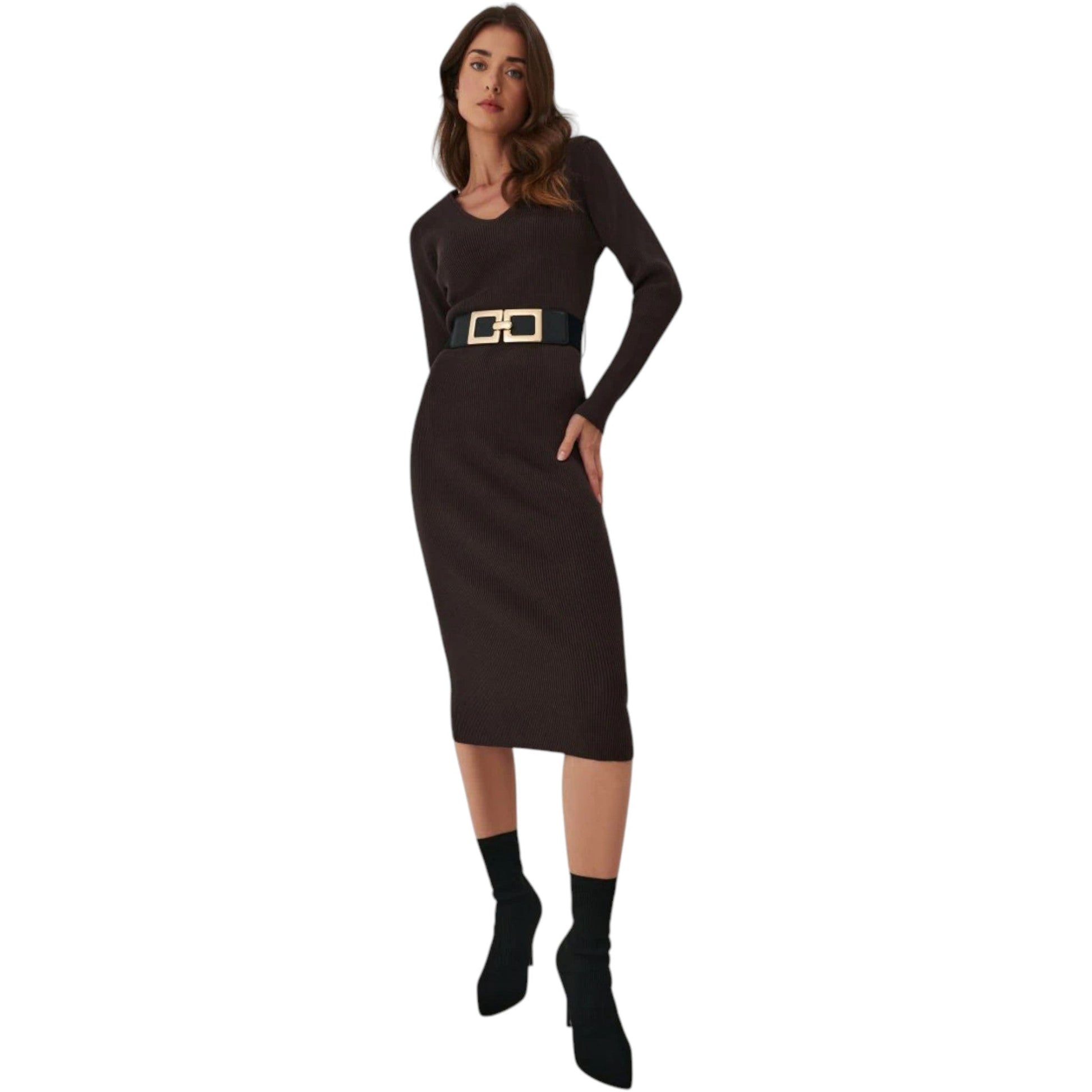 Címke nélküli, barna, hosszú ujjú, kötött, bordázott anyagú, térd alá érő midi ruha, hátul V-nyakkivágással.