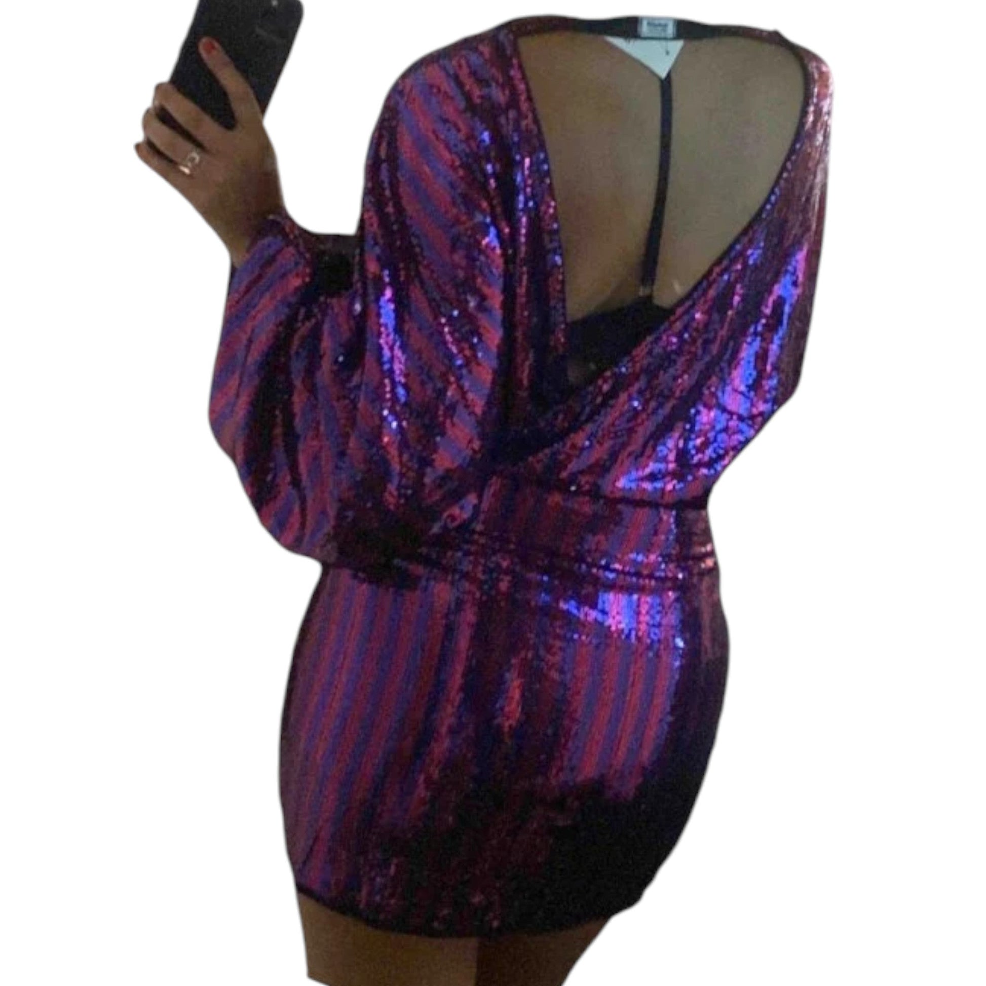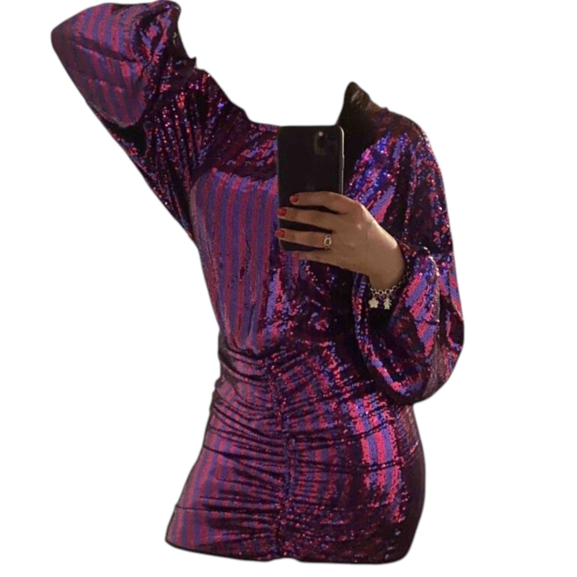Címke nélküli, lila és pink csíkos, teljes felületén flitteres, magas nyakú, denevérujjú, elöl ráncolt, rövid mini ruha.