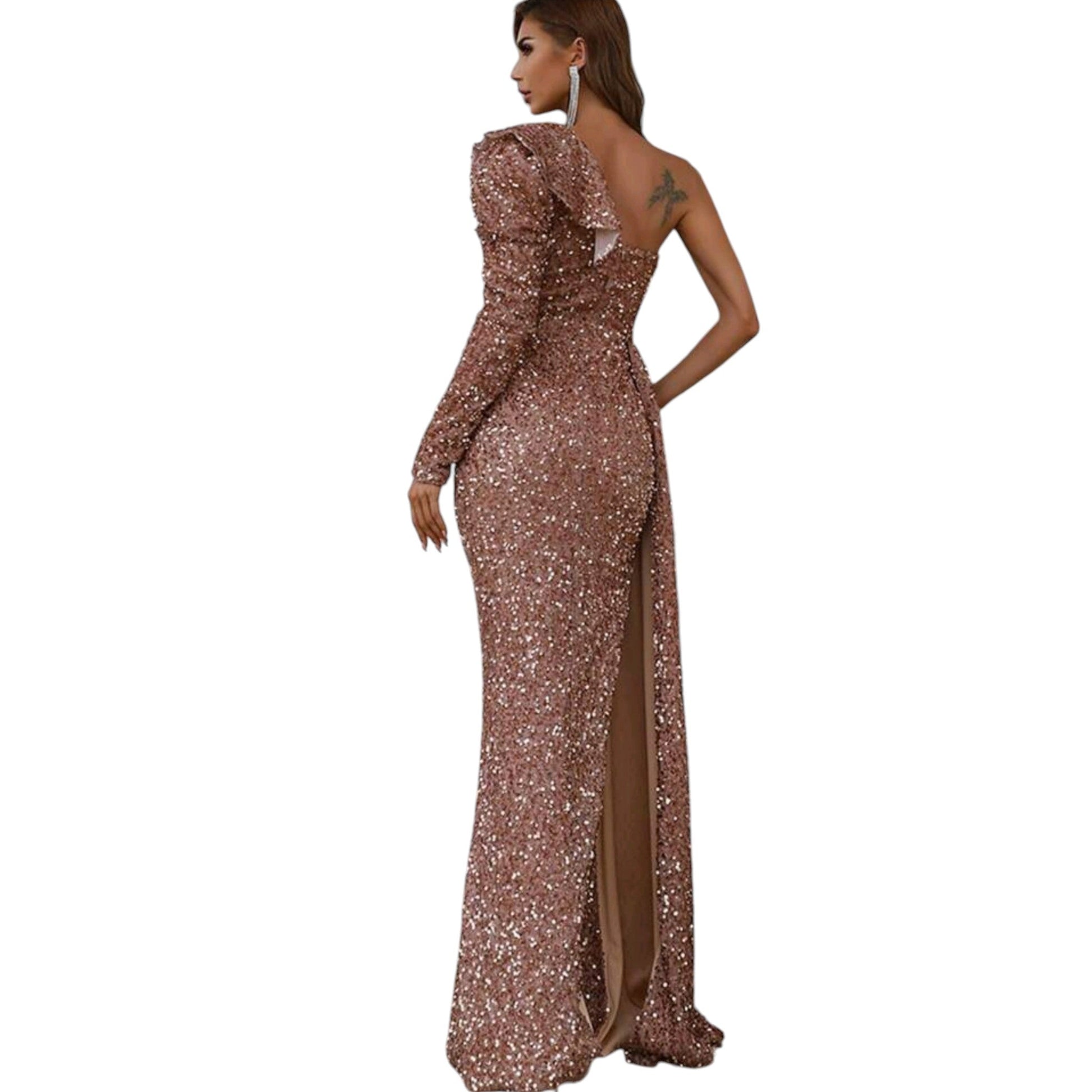Címke nélküli, rozé arany, hosszú, flitterekkel borított, egyik vállon pufi hosszú ujjú, aszimmetrikus, magas hasítékkal ellátott estélyi ruha.