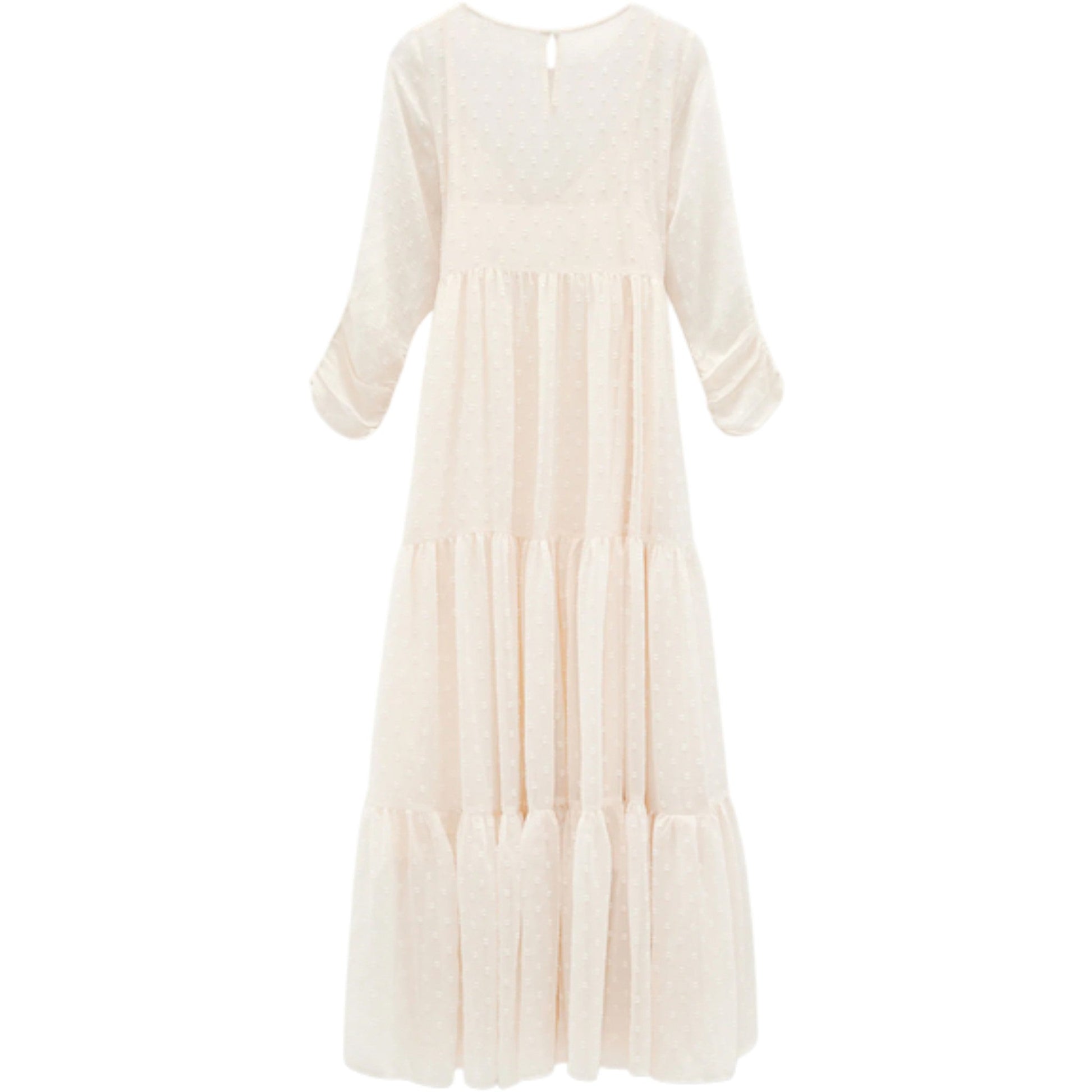 Címke nélküli, púderrózsaszín, apró, tonális pöttyös mintájú, 3/4-es ujjú, kerek nyakú maxi ruha, rakott szoknyarész több szinten (fodrokkal), bevarrt ujjatlan alsóruha.
