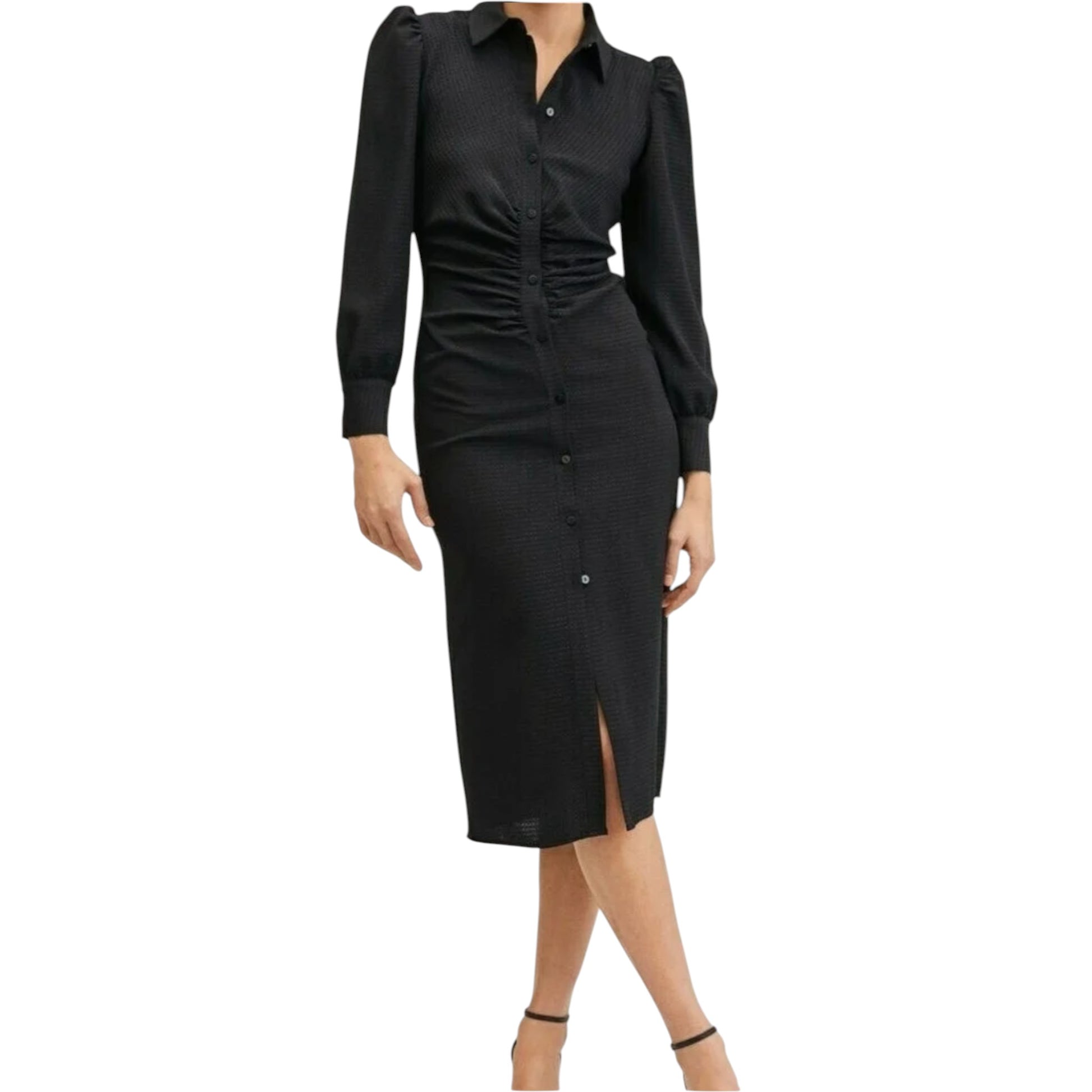 Címke nélküli, fekete, hosszú ujjú, gombos, galléros, elöl és oldalt ráncolt, elöl sliccelt ingruha.