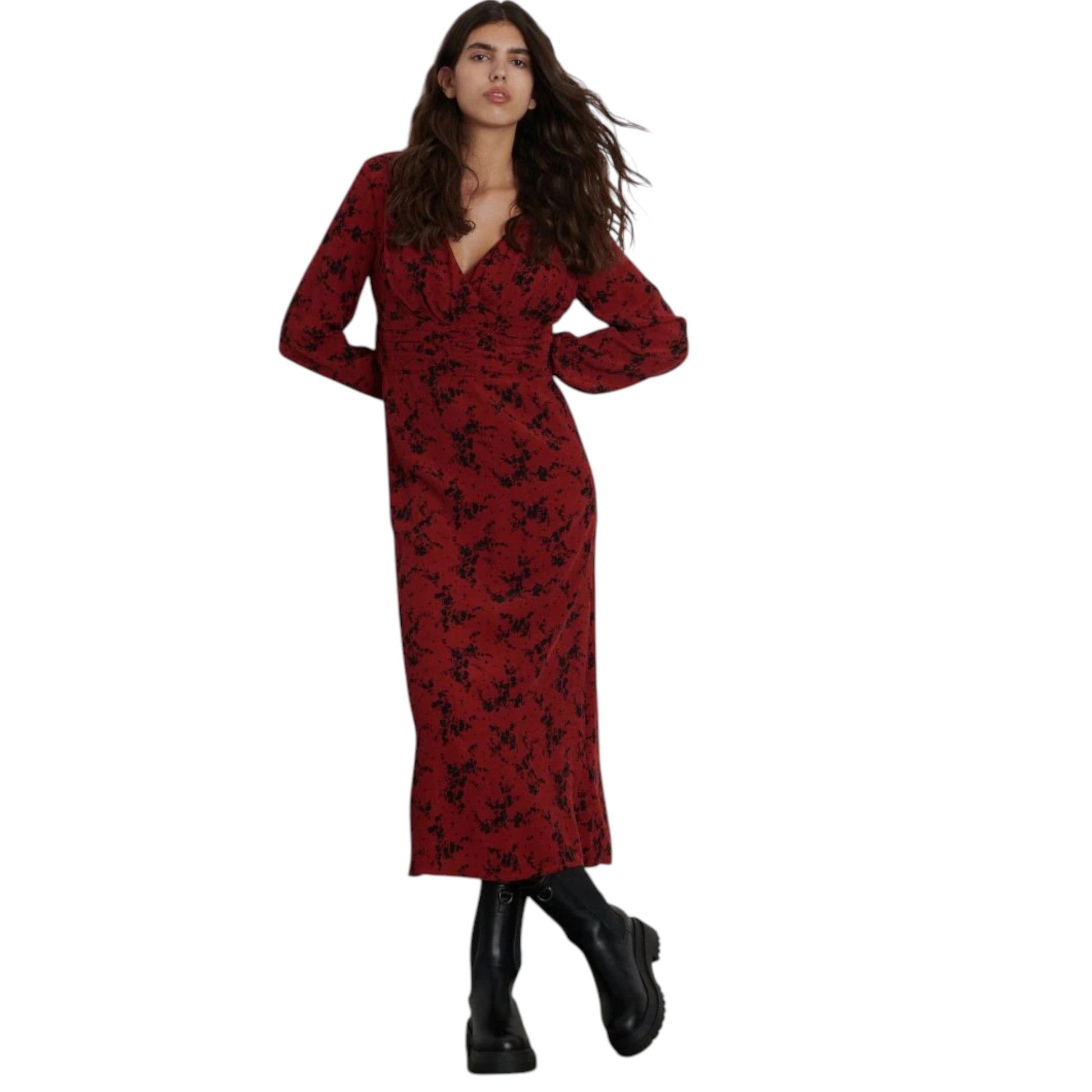 Címke nélküli, piros, fekete apró mintás, hosszú ujjú, mély V-nyakú, derékrészen ráncolt, bő szoknyás, maxi hosszúságú.