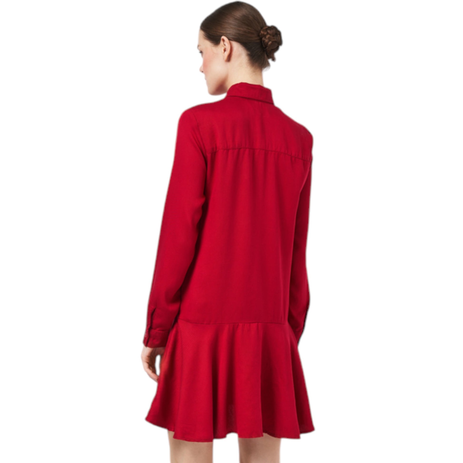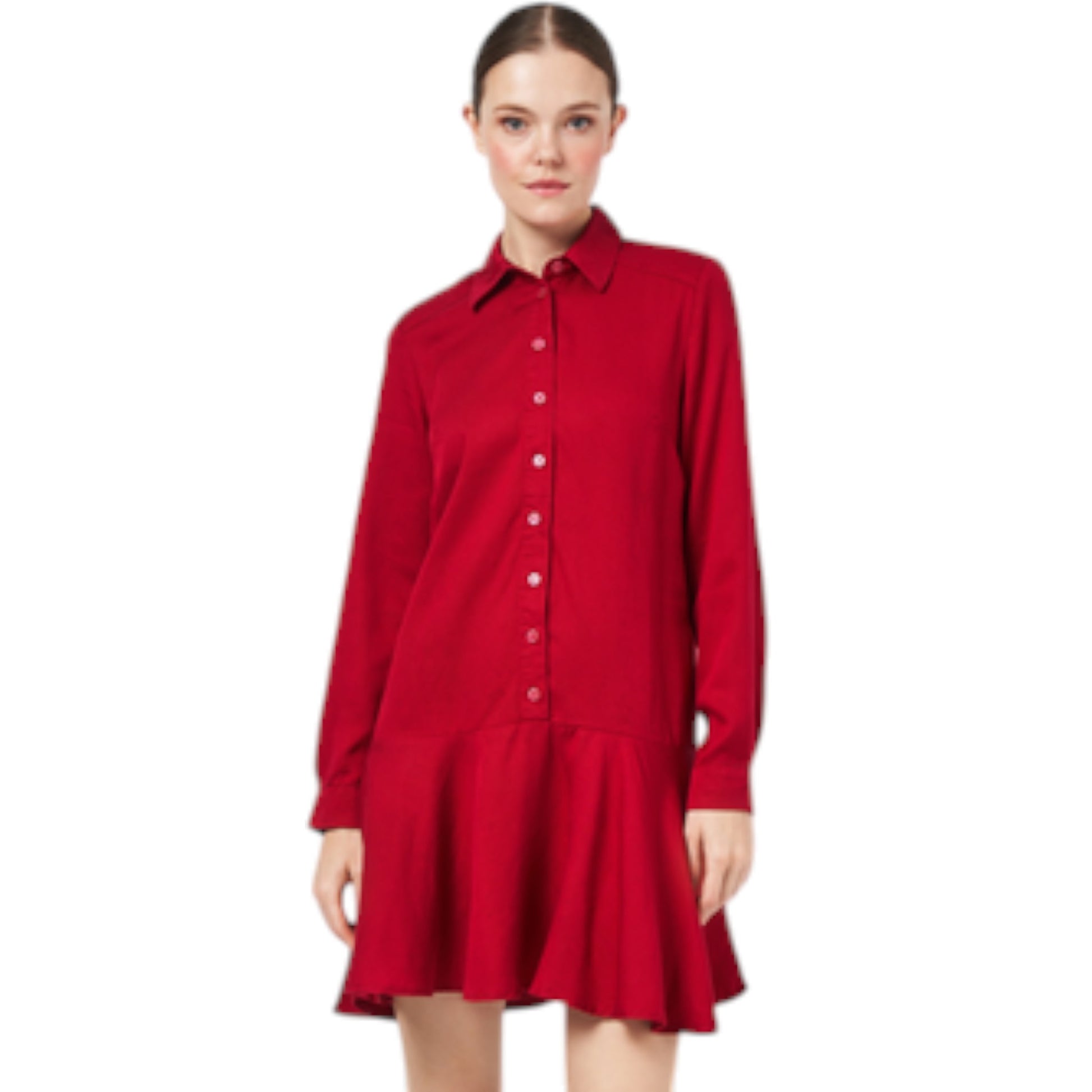Címke nélküli, piros, hosszú ujjú, galléros, gombos, fodros alsórészű ingruha.