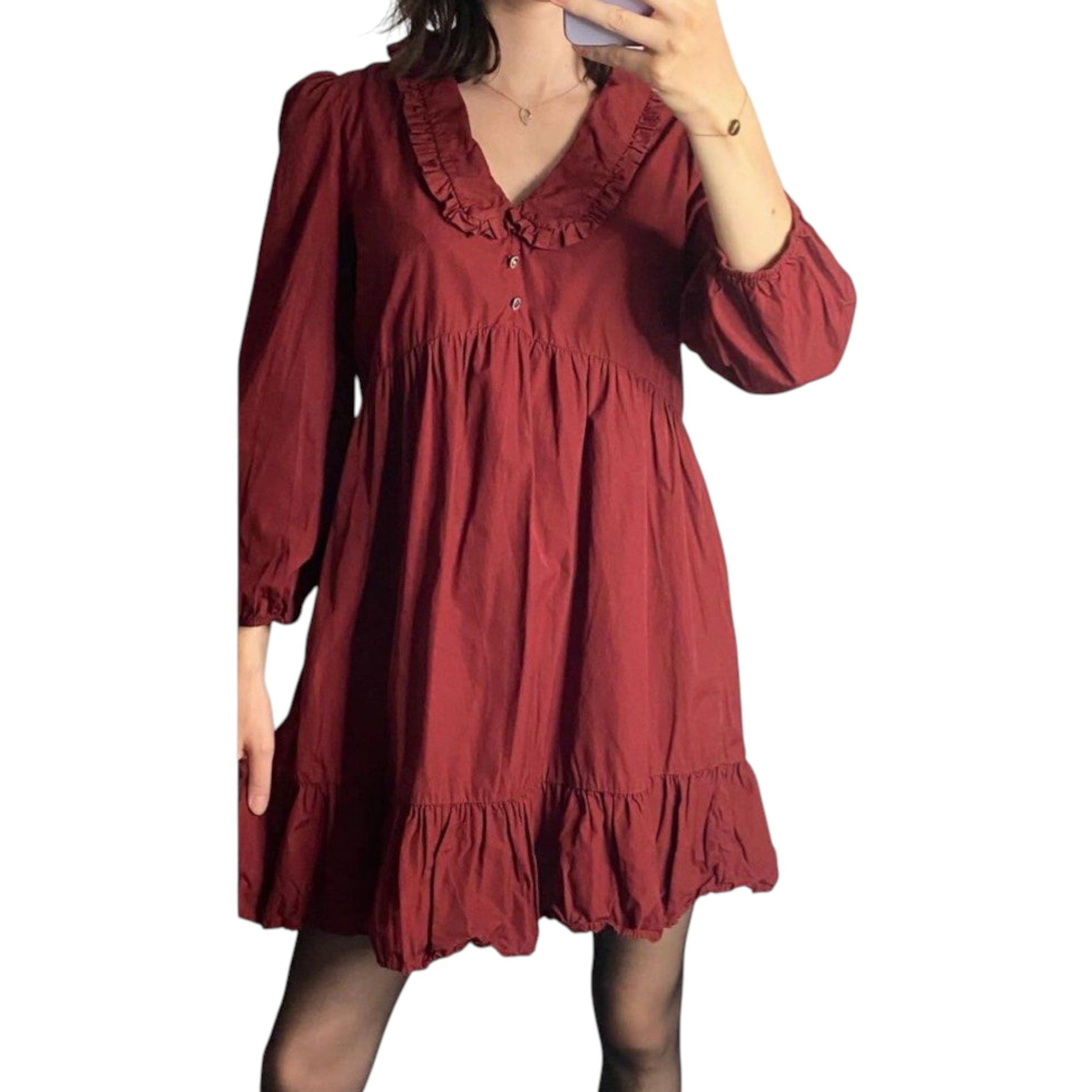 Címke nélküli, bordó, V-nyakú, fodros galléros, 3/4-es puffos ujjú, bő szabású, fodros alsó szegélyű, rövid mini ruha, mellrészen gombokkal.