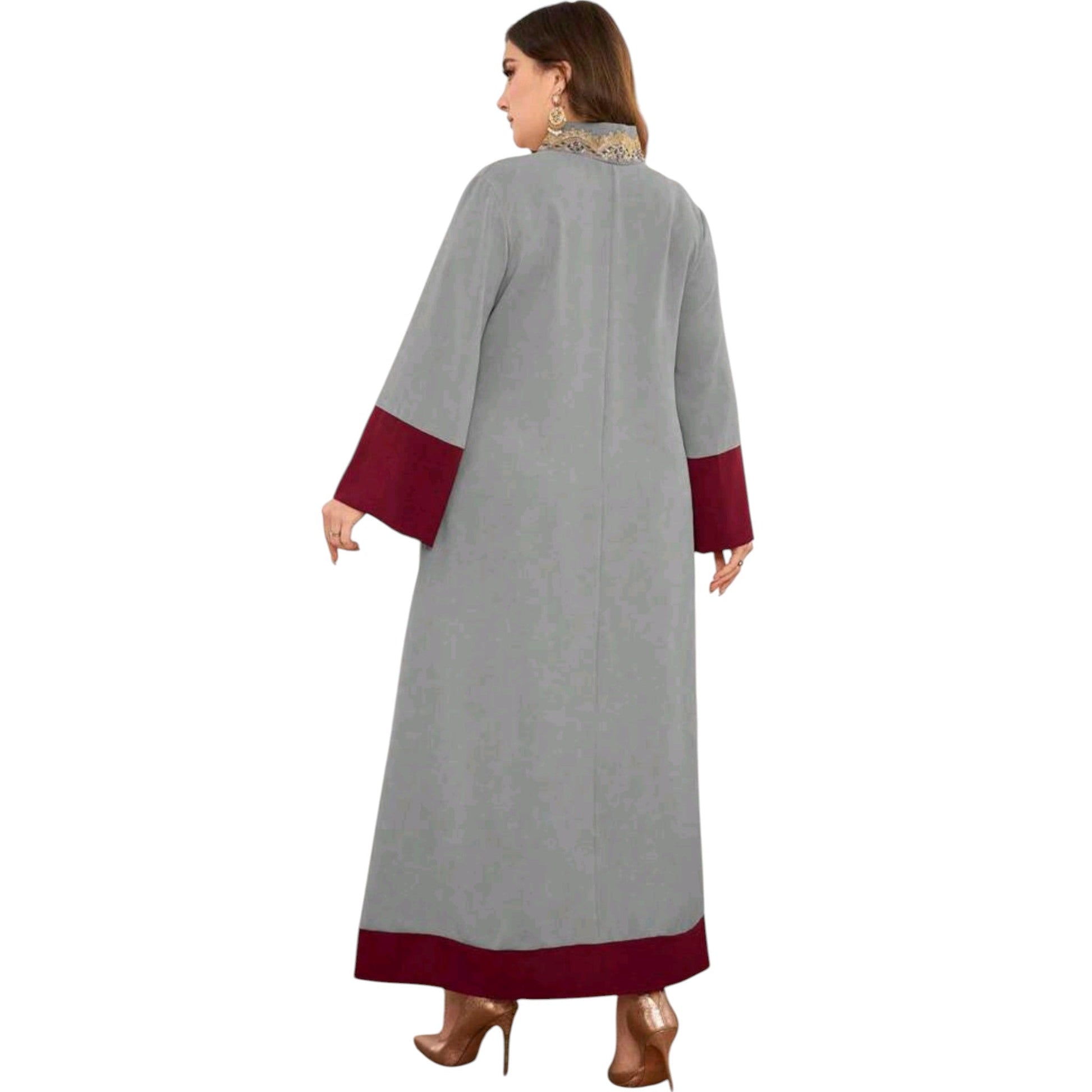 Címke nélküli, szürke, bordó részletekkel, hímzett nyakú, hosszú abaya.