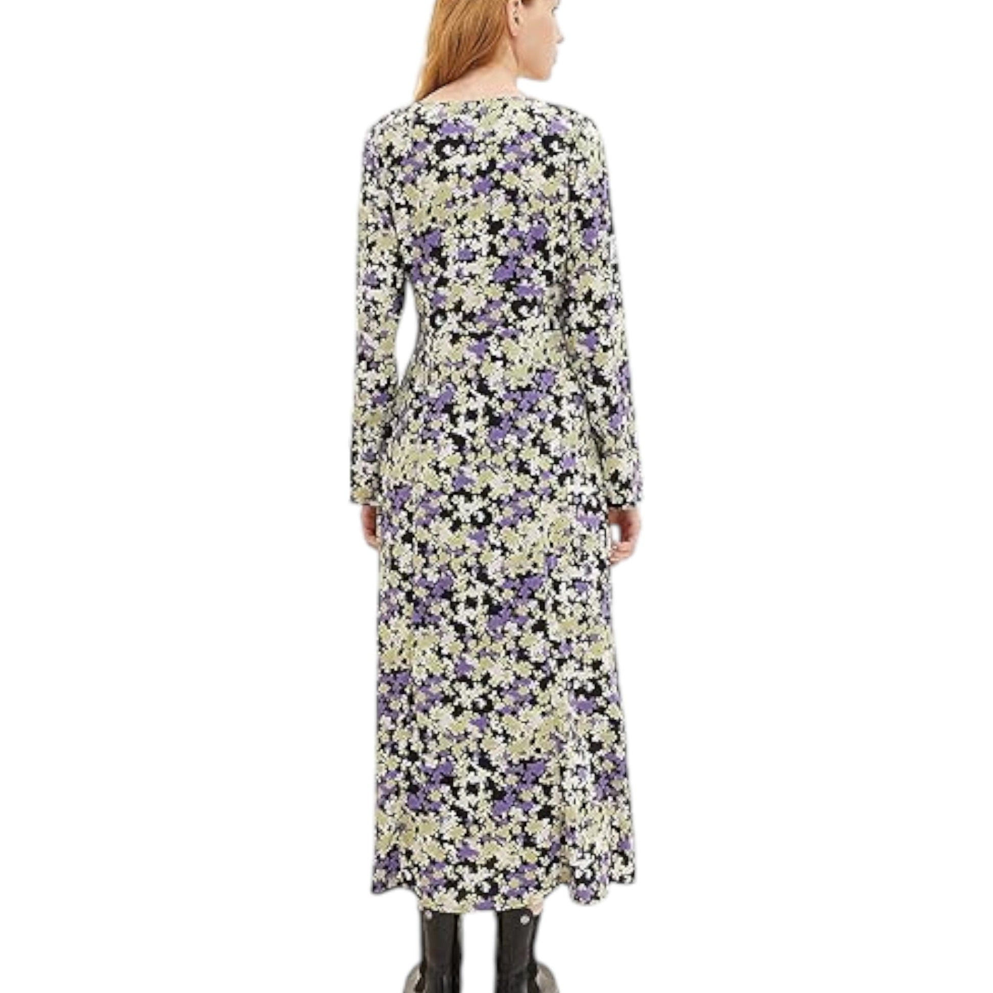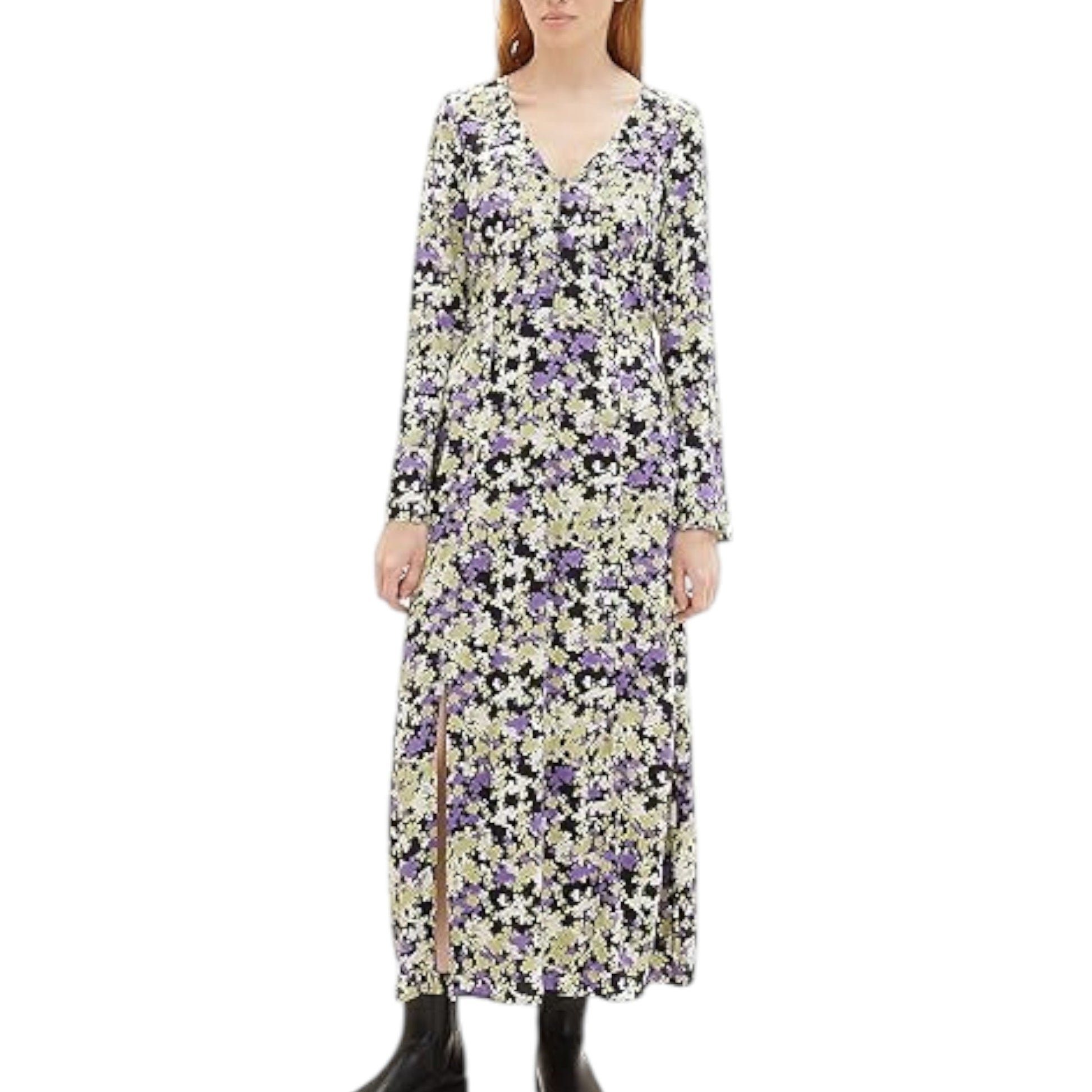 Címke nélküli, fekete-lila-halványzöld-fehér, apró virágmintás, hosszú ujjú, karcsúsított vonalú, bokáig érő maxi ruha részlete, hasítékkal.