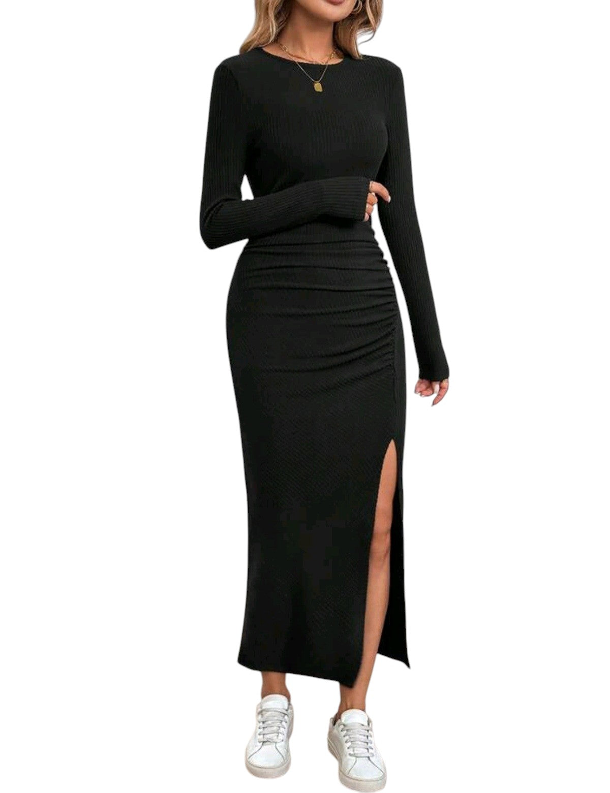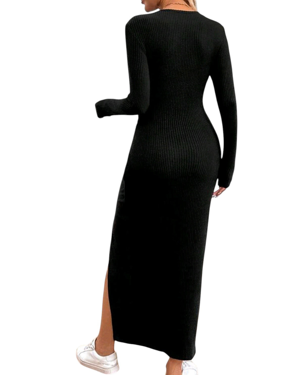 Címke nélküli, fekete, bordázott, hosszú ujjú, kerek nyakú, testhezálló, oldalt ráncolt, hasítékkal