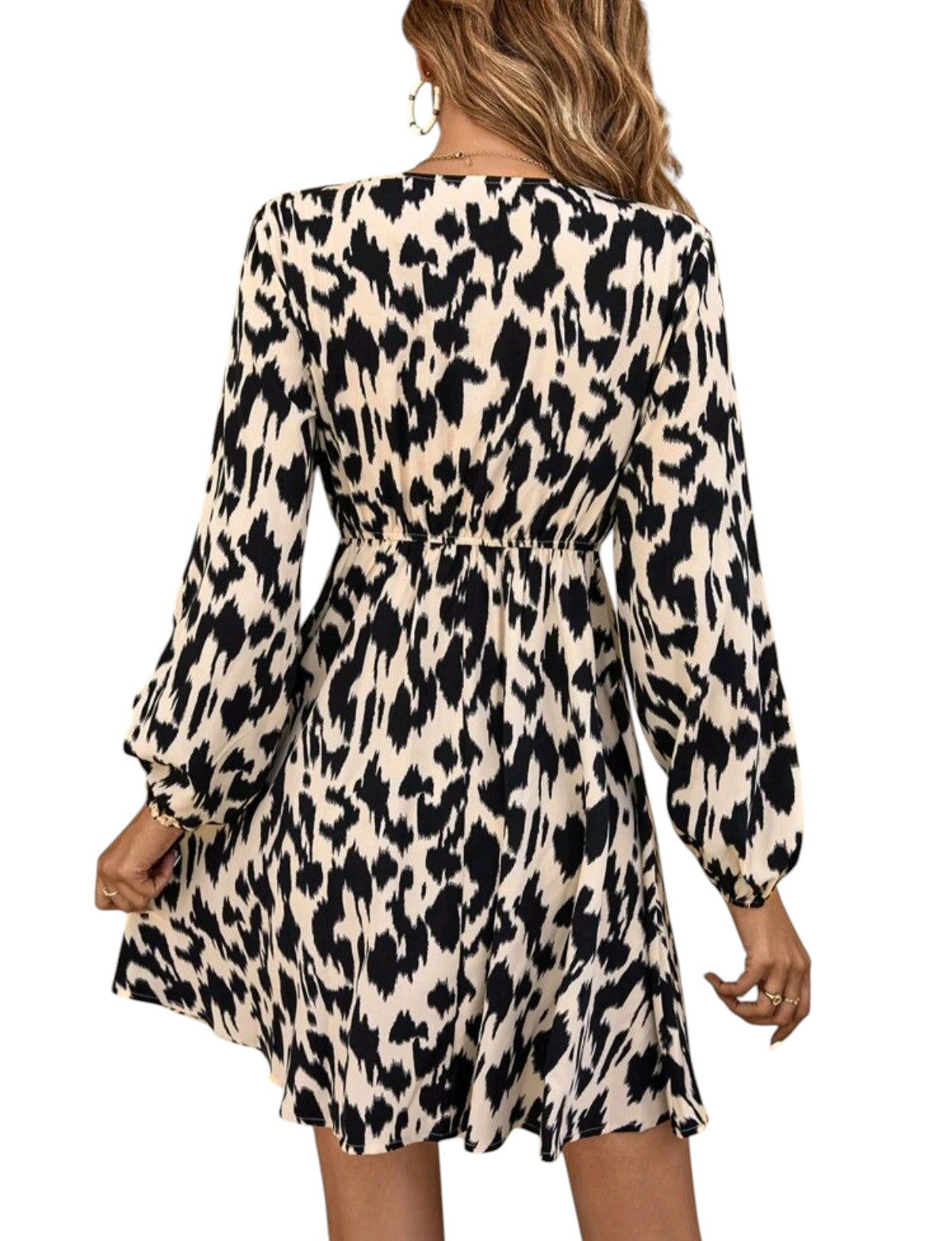 Címke nélküli, fekete-bézs, állatmintás, hosszú ujjú, V-nyakú, gumírozott derék, A-vonalú