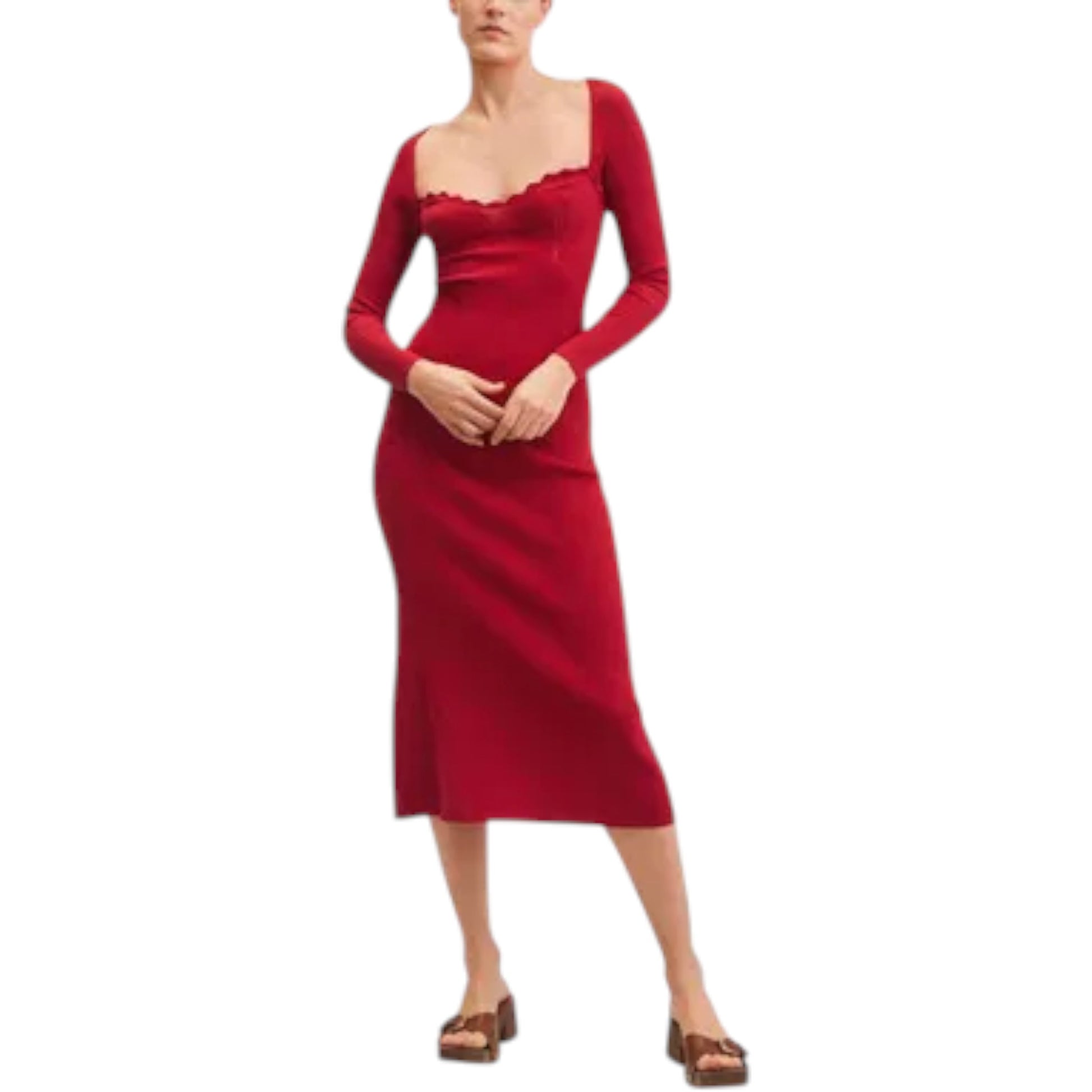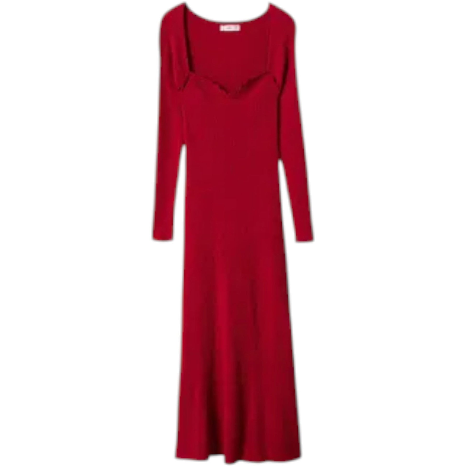 Címke nélküli, piros, hosszú ujjú, kötött anyagú, térd alá érő midi ruha, szűk, testhez simuló fazonban, szív alakú, fodros szegélyű dekoltázzsal.