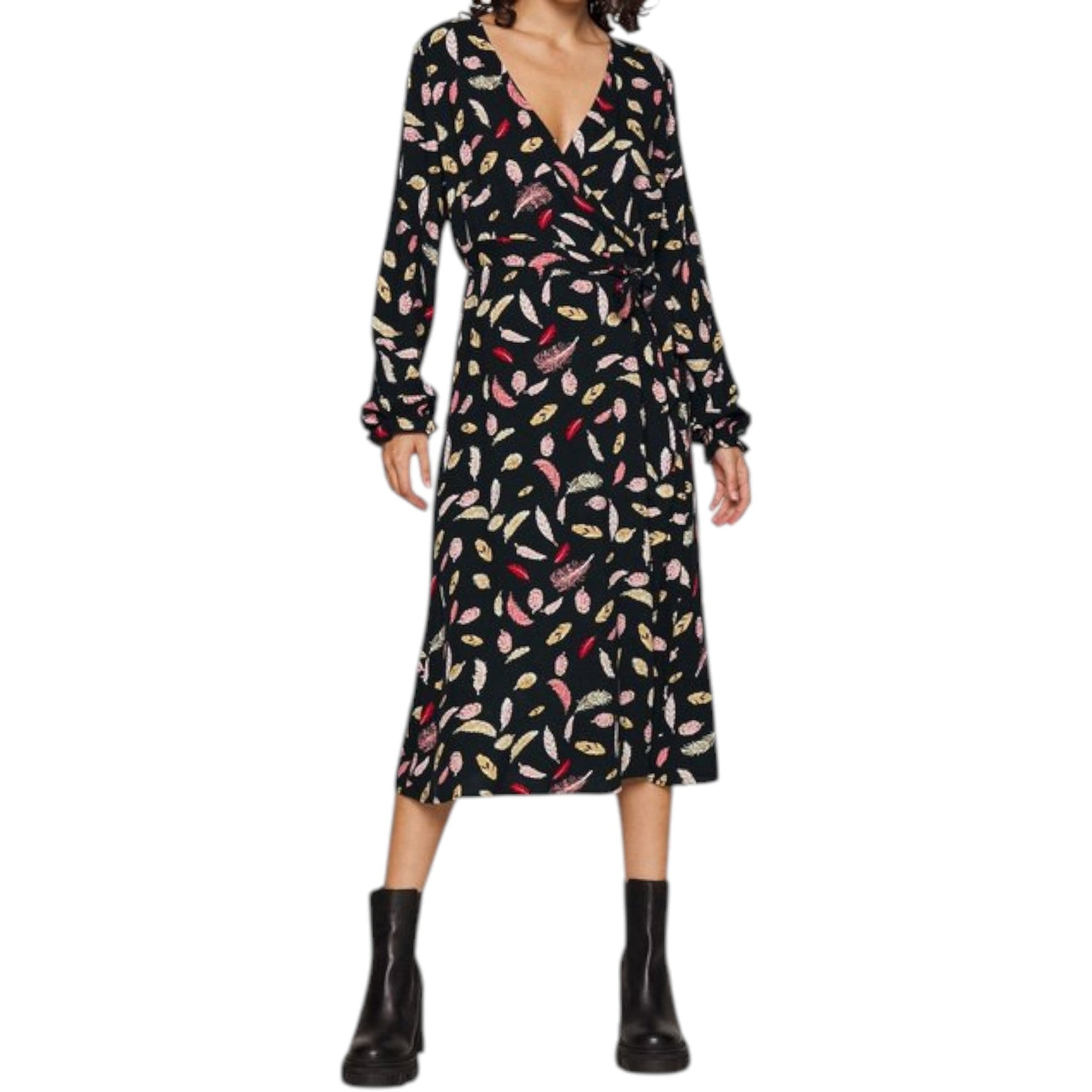 Címke nélküli, fekete, színes toll mintázatú (piros, rózsaszín, sárga, bézs), átlapolós (wrap) fazon, V-nyakú, hosszú ujjú, ráncolt mandzsettával, midi ruha.