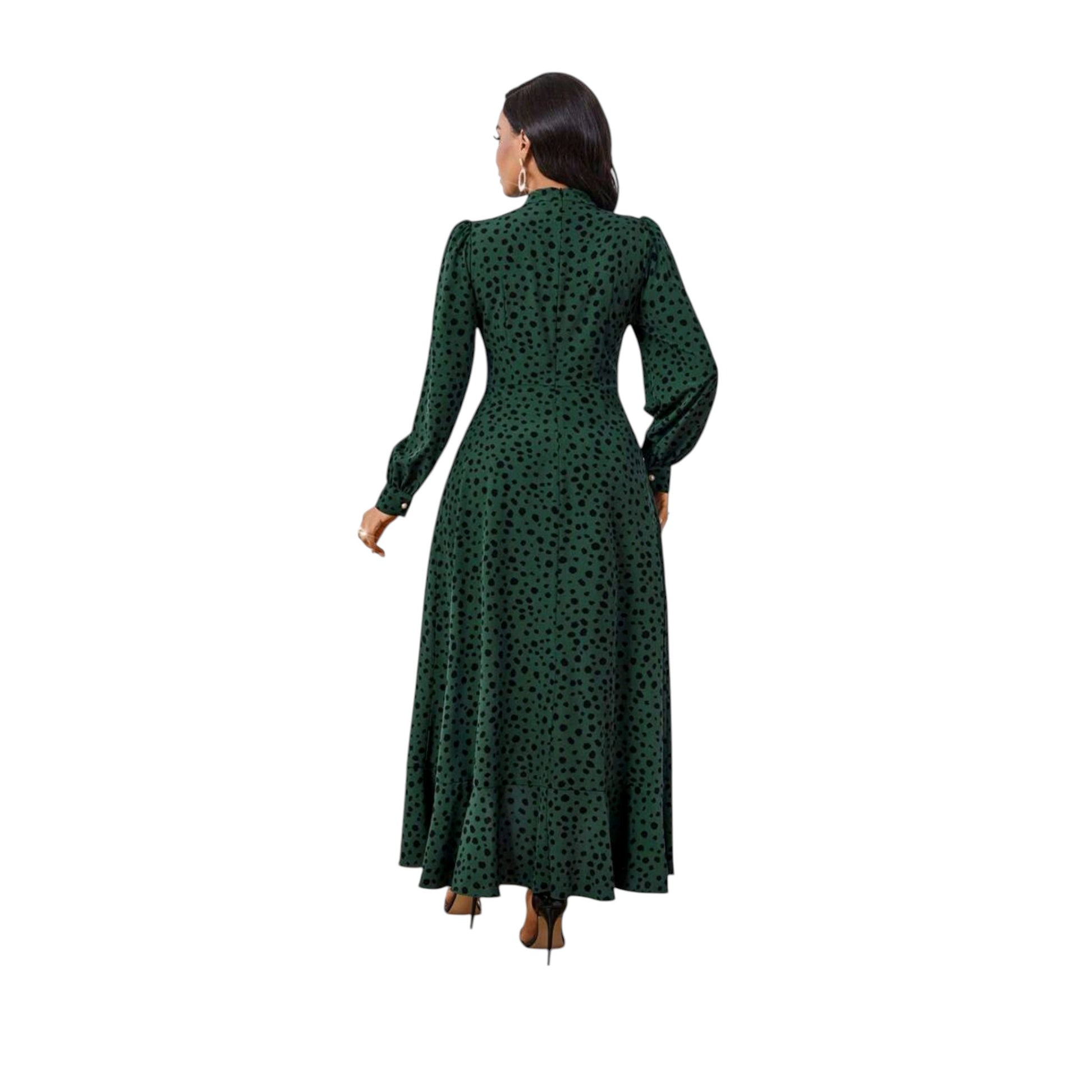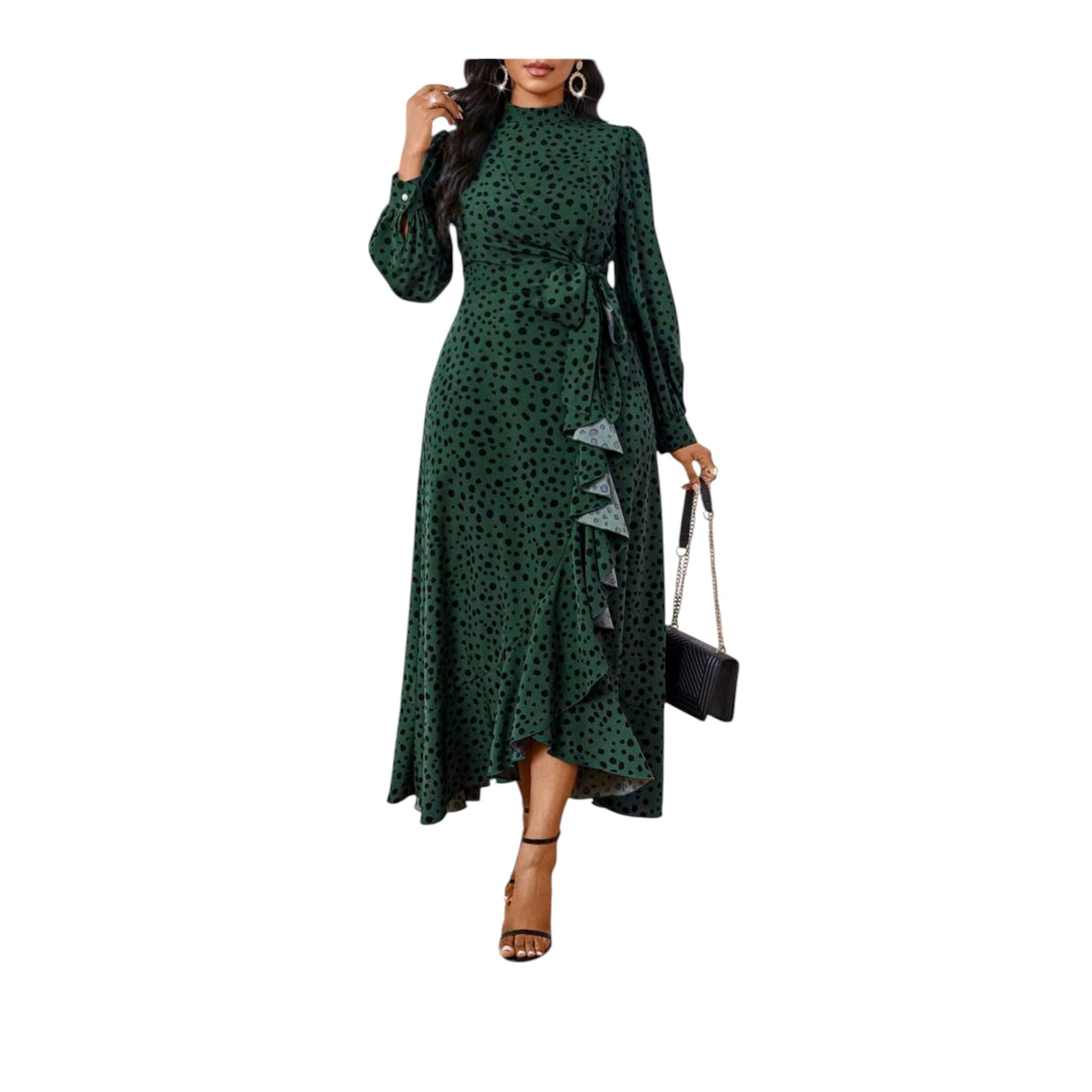Címke nélküli, zöld alapon fekete pöttyös, magas nyakú, hosszú ujjú, megkötős, fodros szegélyű, átlapolt midi ruha