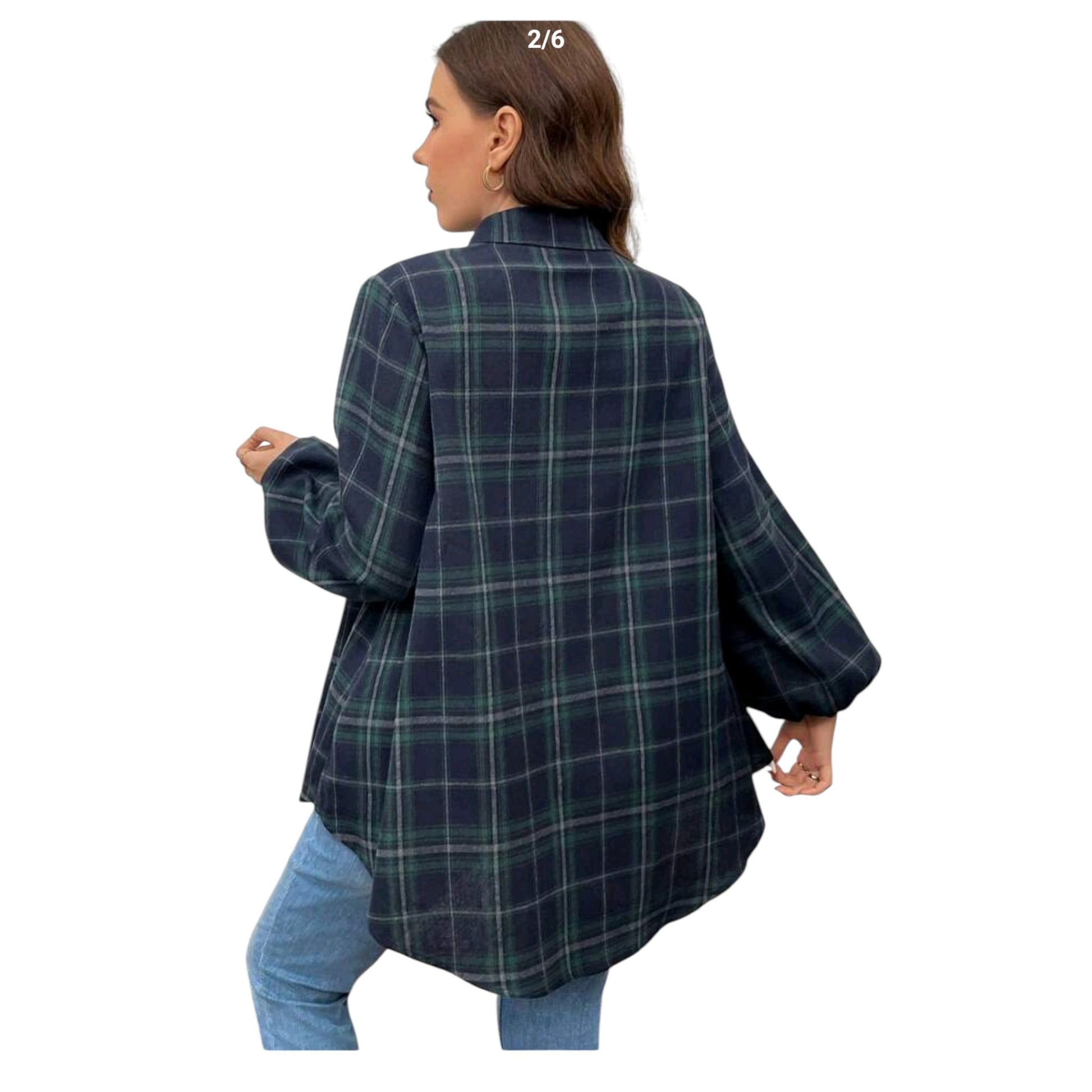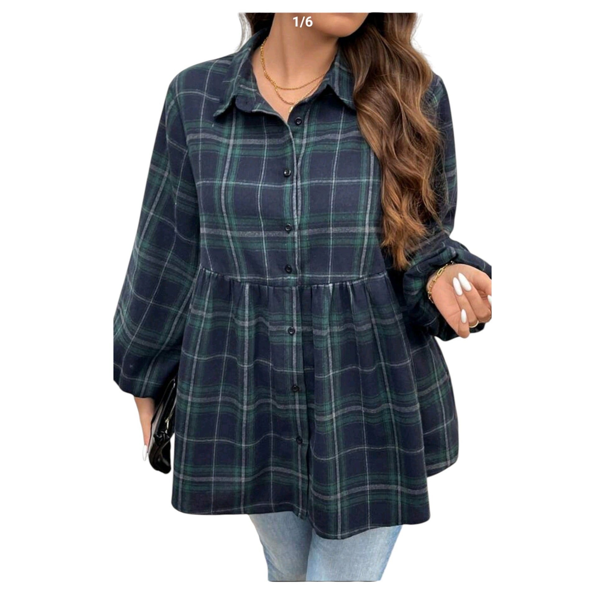Címke nélküli, sötétkék és zöld kockás, galléros, hosszú ujjú, gombos, fodros szegélyű ingruha