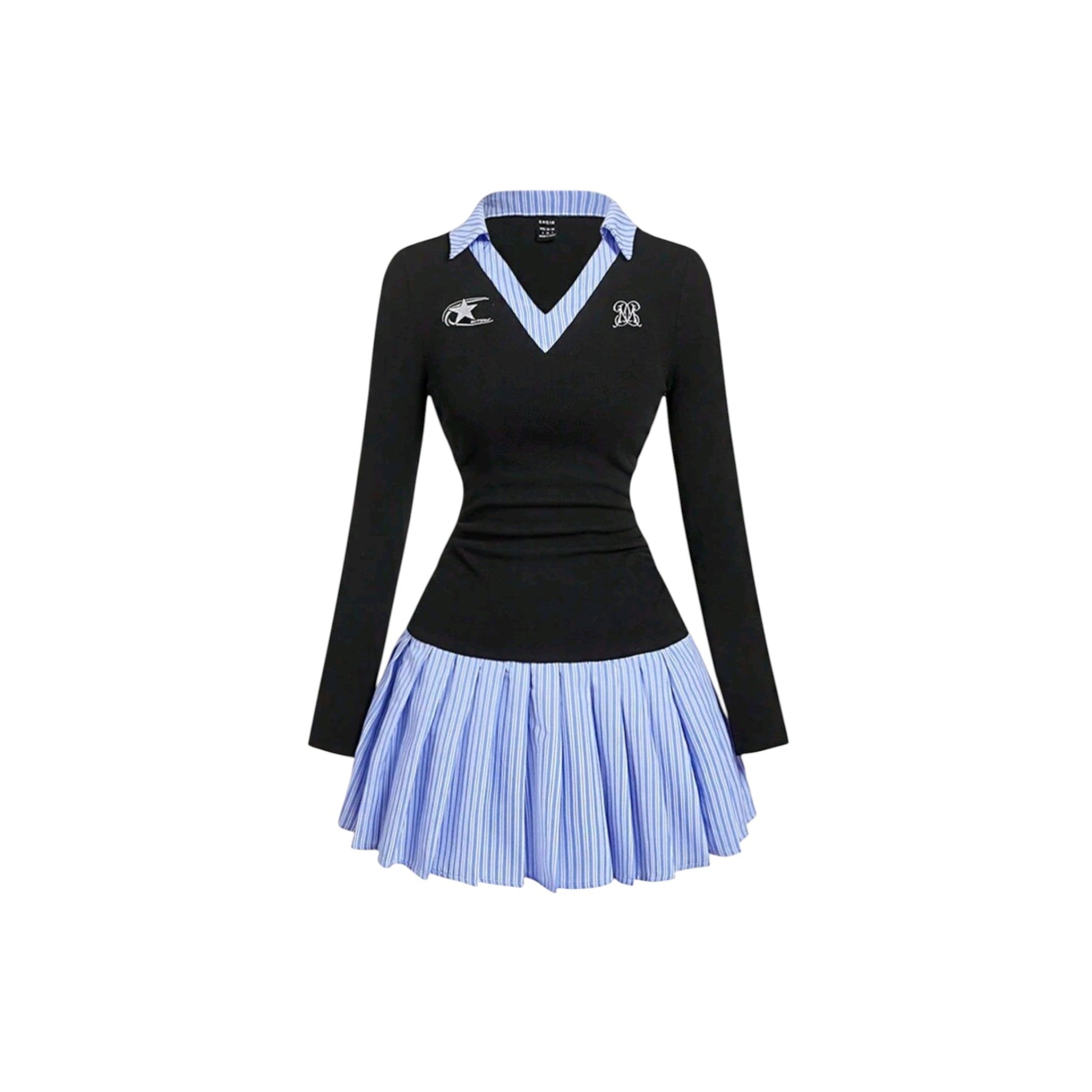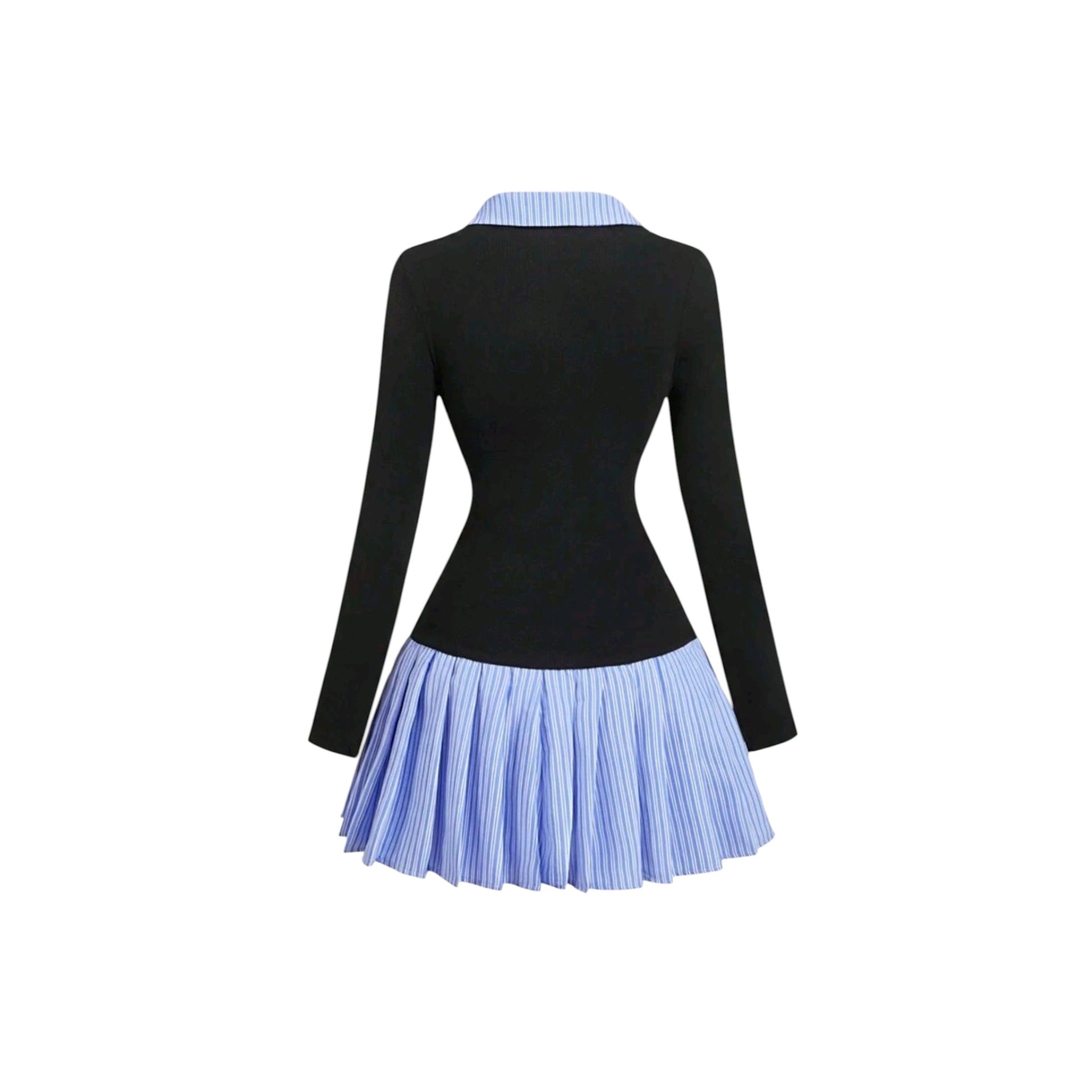 Címke nélküli, fekete felsőrész kék és fehér csíkos gallérral, hosszú ujjú, kék és fehér csíkos, pliszírozott szoknyás kötött ruha