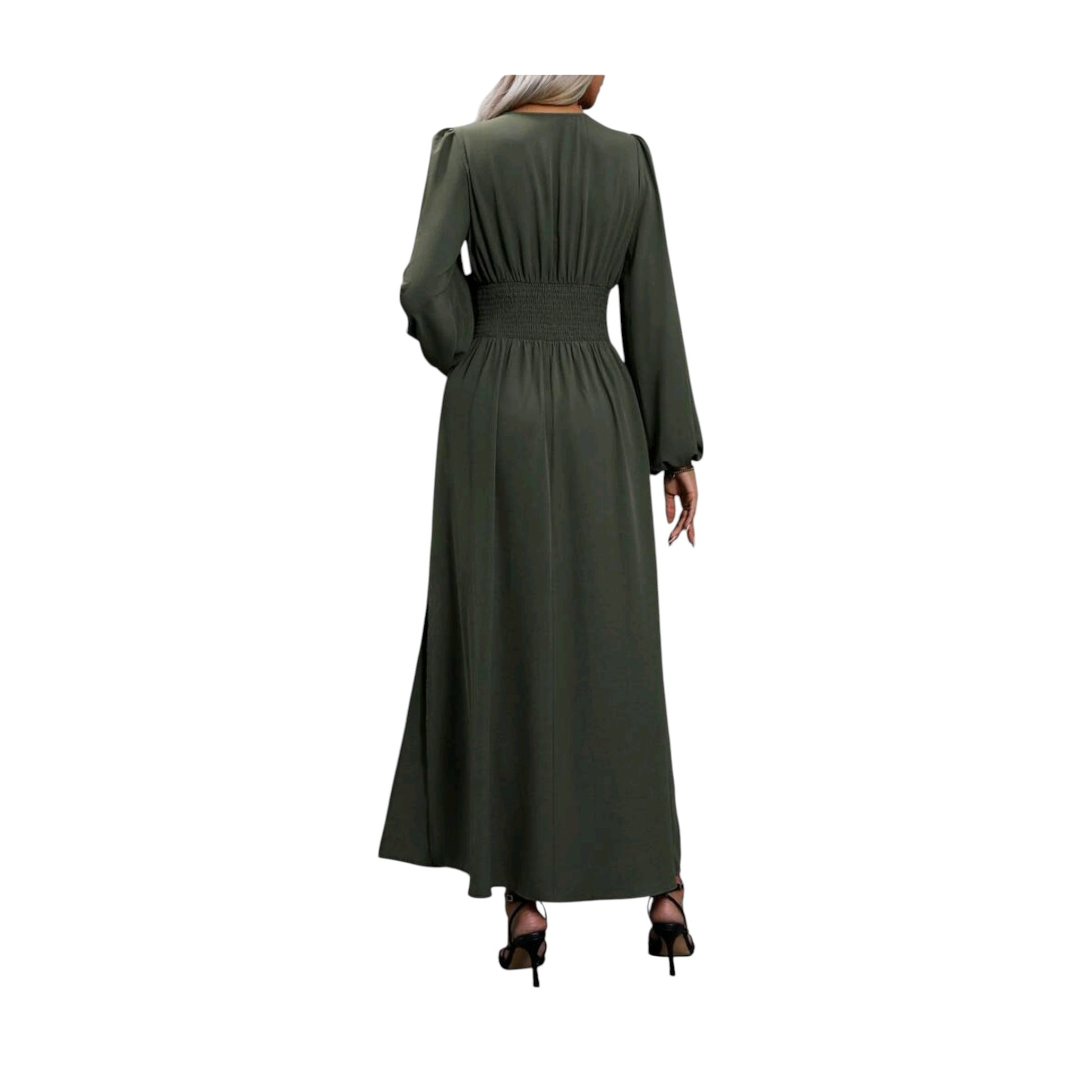 Címke nélküli, olívazöld, V-nyakú, hosszú, puffos ujjú, átlapolt, combközépig sliccelt maxi ruha
