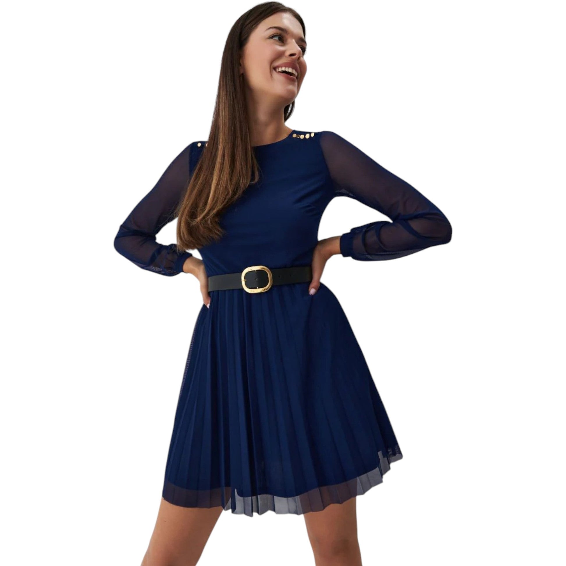 Címke nélküli, sötétkék, hosszú, áttetsző ujjú, rövid (mini) ruha, pliszírozott (rakott) szoknyarésszel, kerek nyakkivágással, hátul kulcslyuk kivágással.