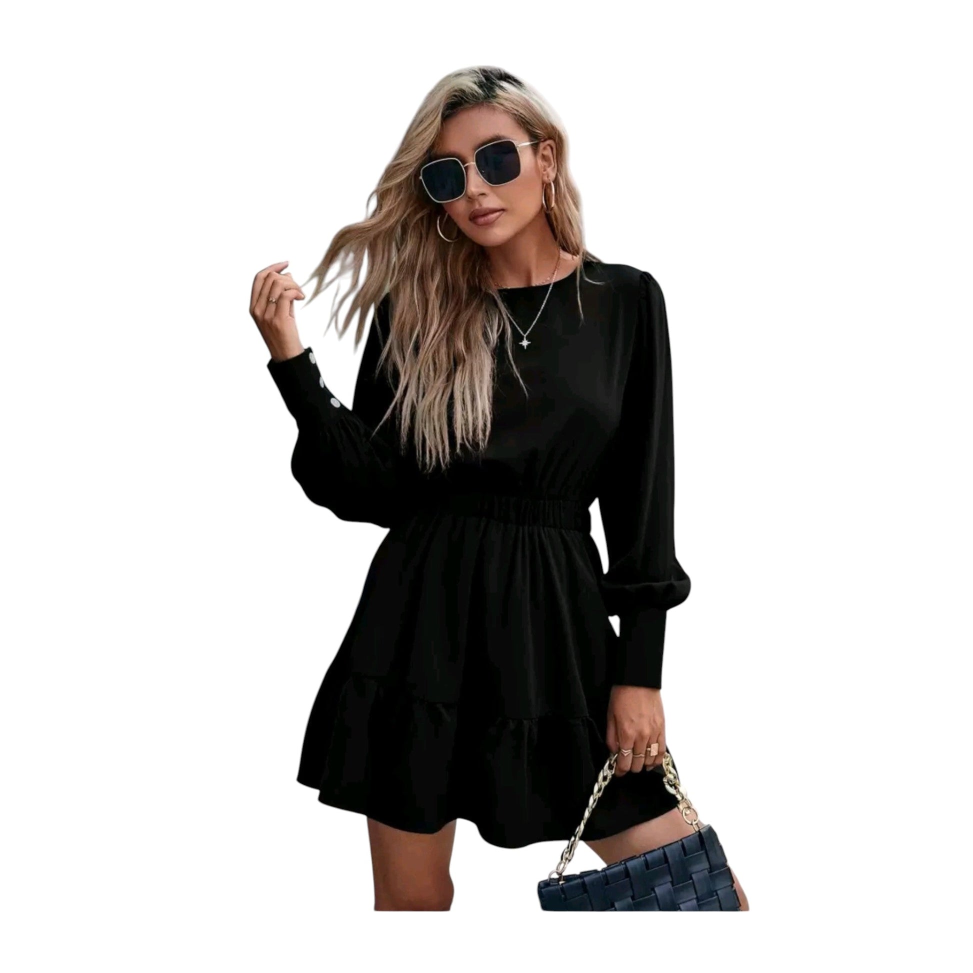 Címke nélküli, fekete, kerek nyakú, hosszú, puffos ujjú, ráncolt derekú, fodros szegélyű mini ruha
