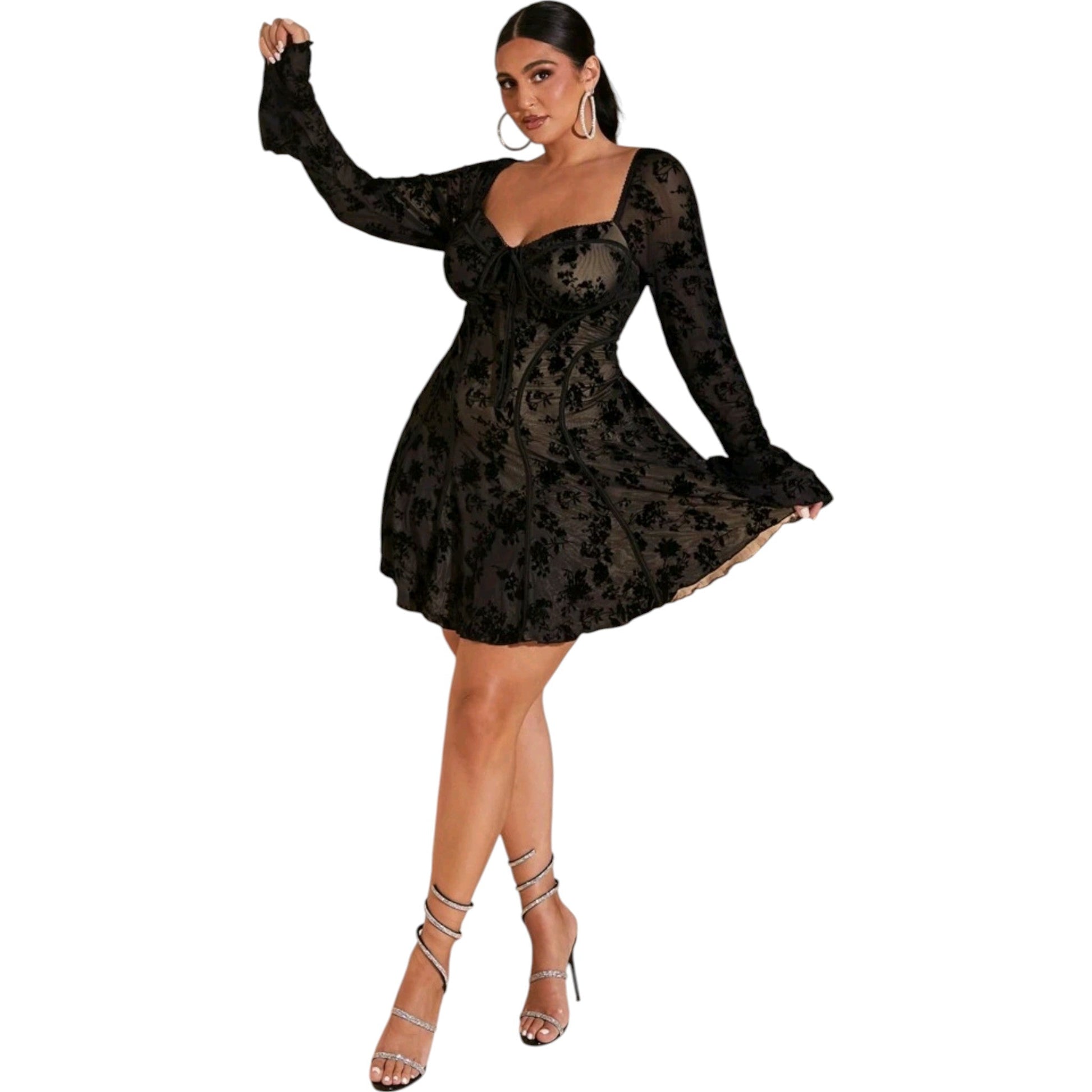 Címke nélküli, fekete, virágos, hosszú ujjú, húzott mellrészű, fodros aljú.