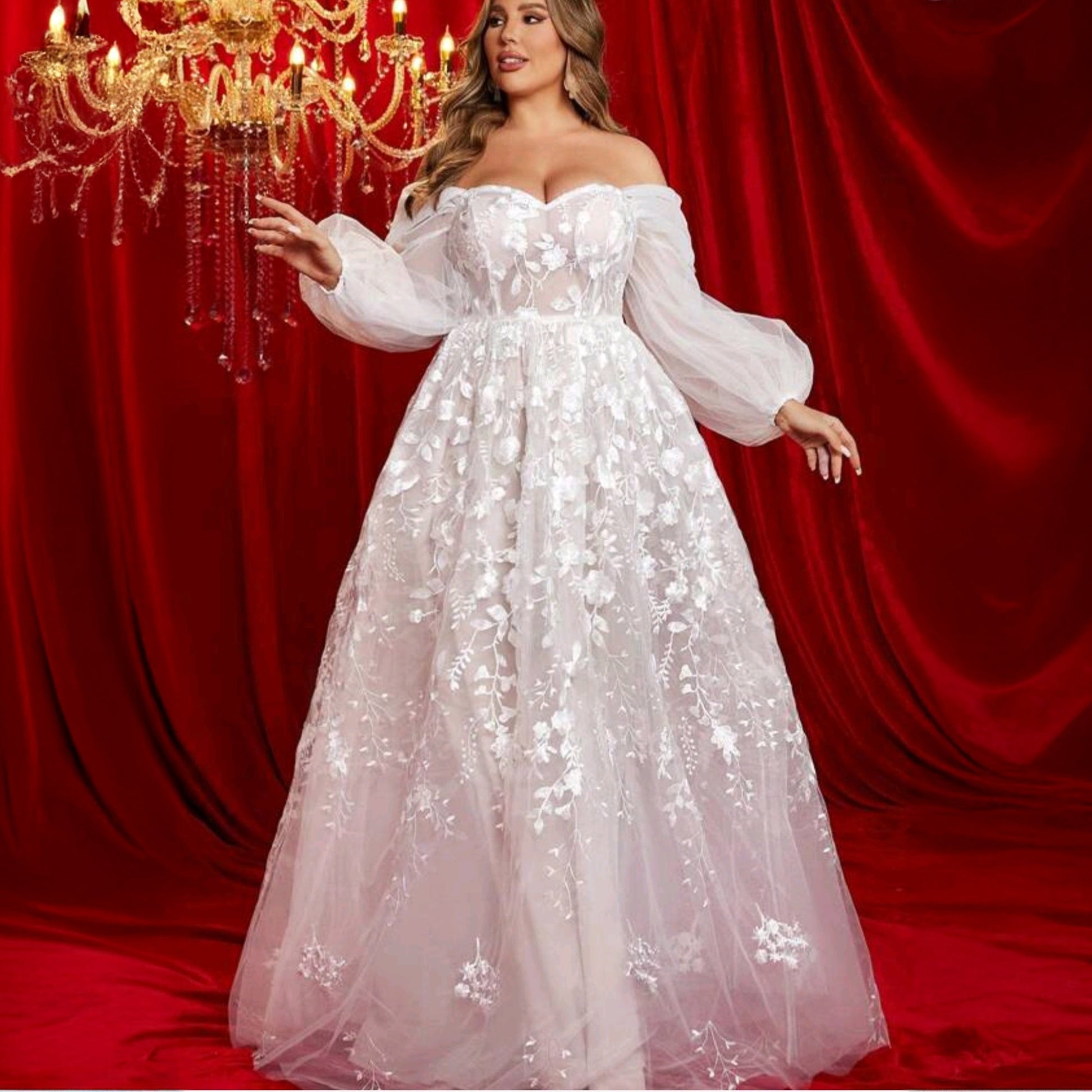 Címke nélküli, fehér, ejtett vállú, hosszú puffos ujjú, hímzett, báli ruha fazonú.