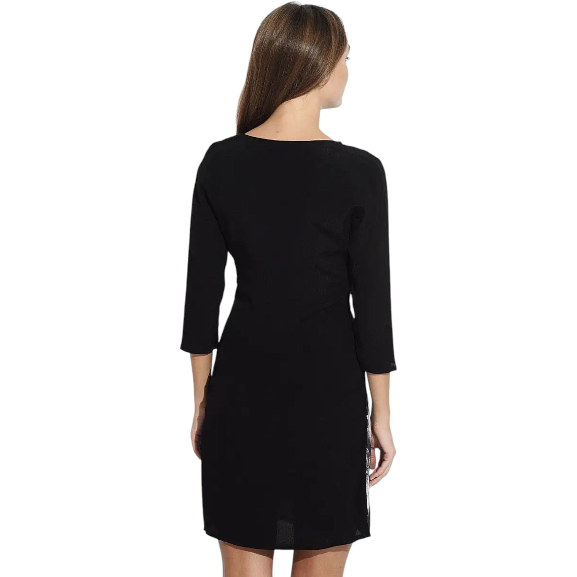 Címke nélküli, fekete-fehér, V-nyakú, 3/4-es ujjú, fekete felsőrésszel és karokkal, márványmintás alsórésszel, mell alatt szabott A-vonalú ruha.