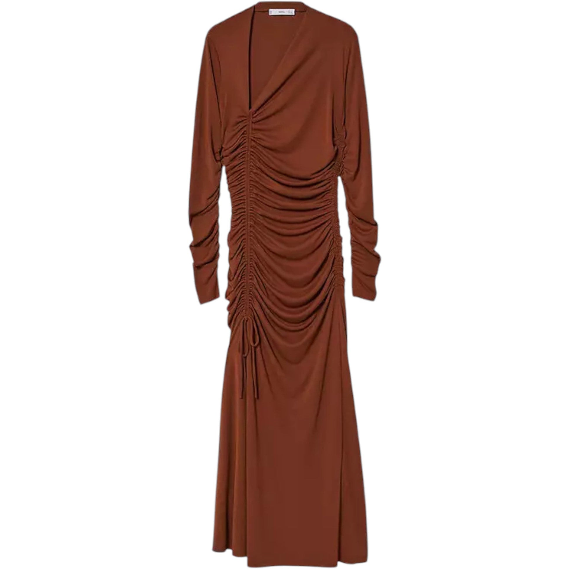 Címke nélküli, barna, hosszú ujjú, mély V-nyakú, testhezálló maxi ruha. Elöl a szoknya rész magasan húzott/ráncolt, oldalt magasan felsliccelve.