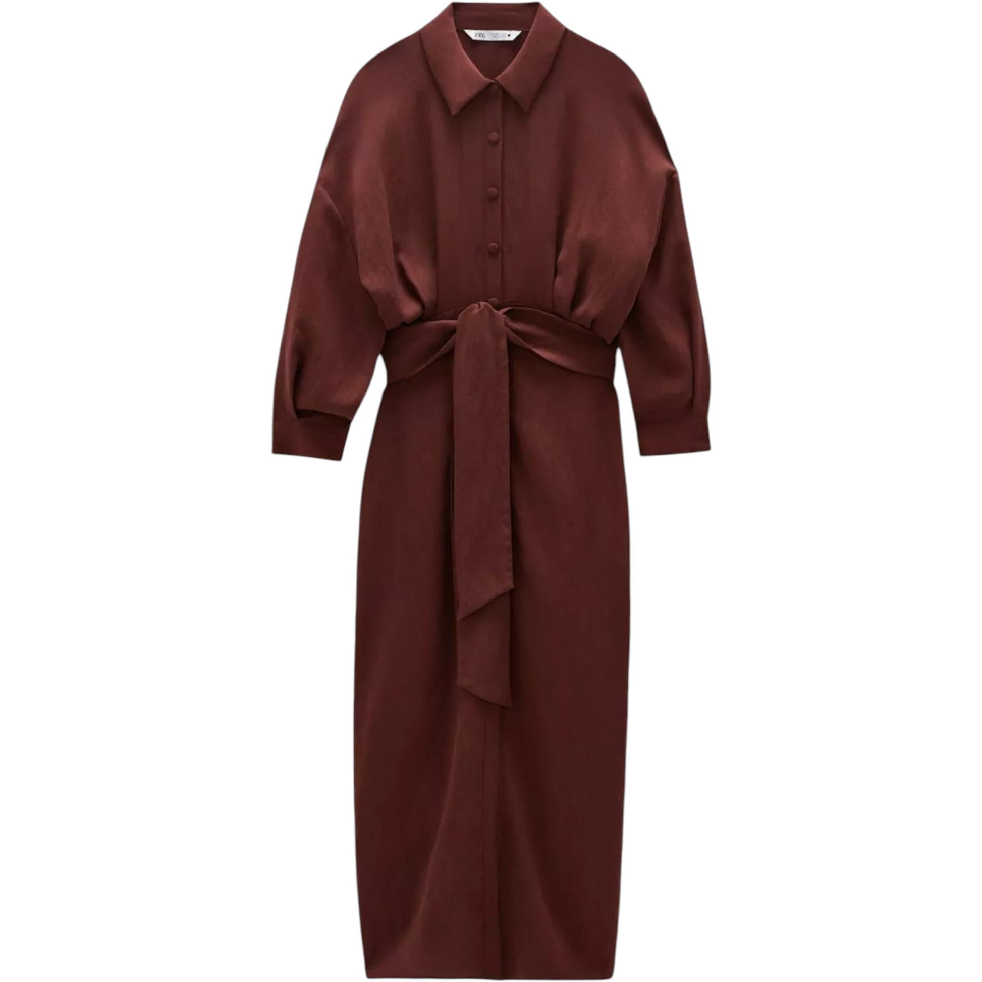 Címke nélküli, bordó, ingfazonú maxi ruha. Hosszú ujjú, elöl végig gombos, galléros, ejtett vállú. (Az övet figyelmen kívül kell hagyni).