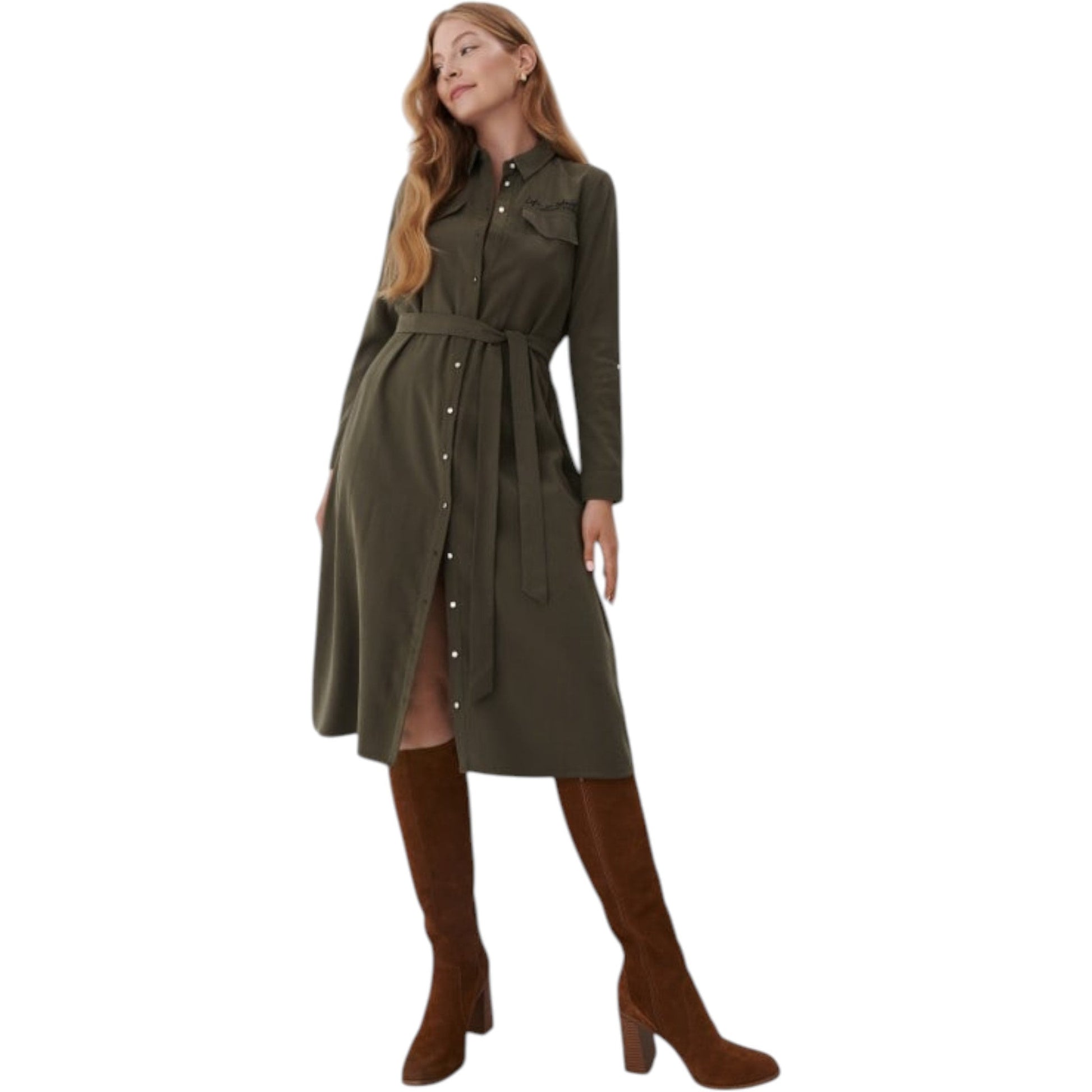 Címke nélküli, khaki, ingfazonú midi ruha. Hosszú ujjú, elöl végig gombos, galléros. (Az övet figyelmen kívül kell hagyni).