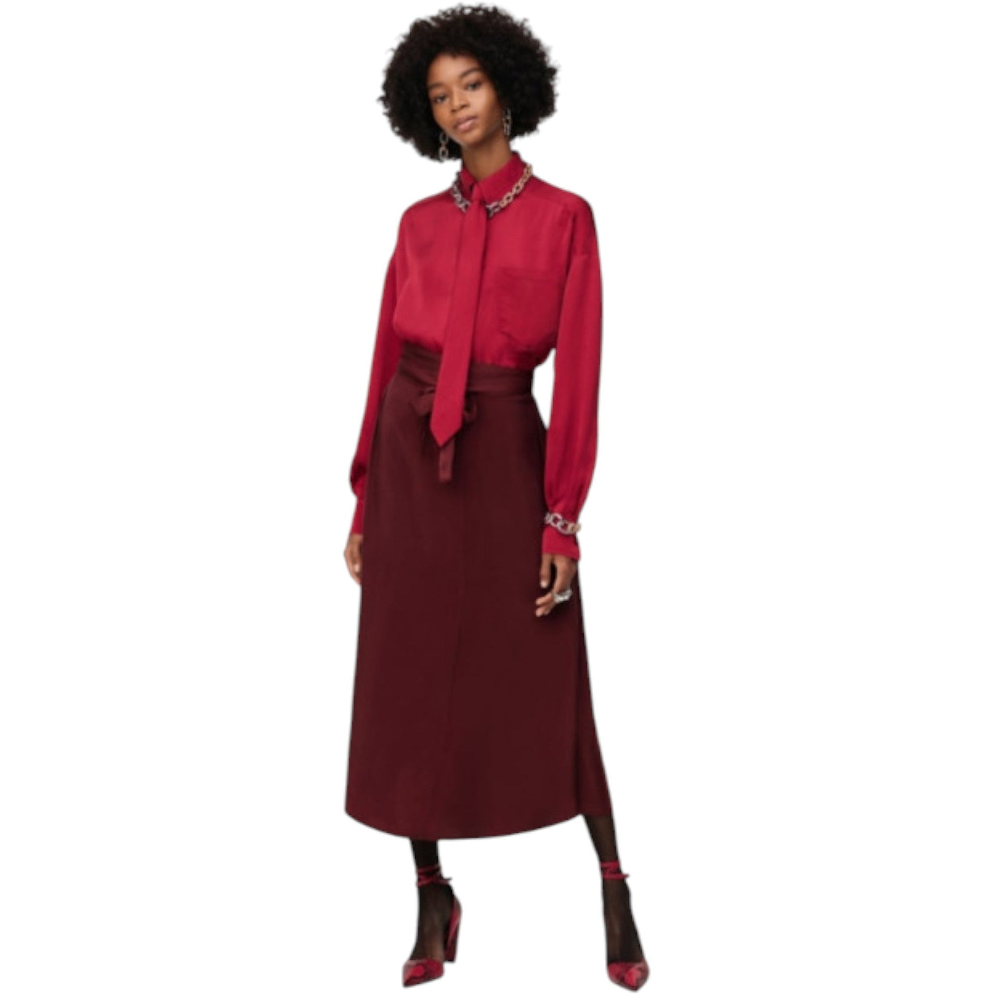 Címke nélküli, piros és bordó midi ruha, hosszú puffos ujjú, nyakkendővel díszítve, A-vonalú, mell alatt szabott.