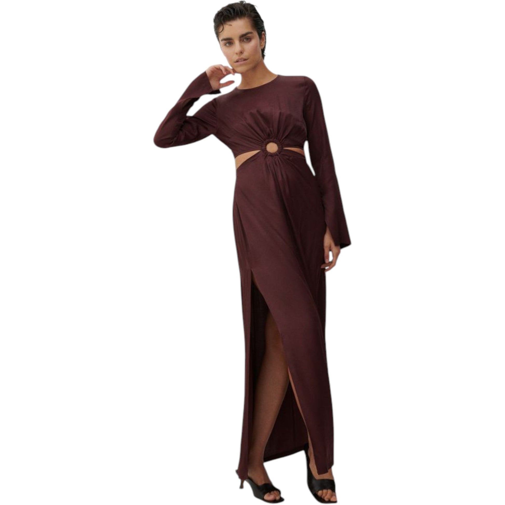 Címke nélküli, bordó, selyem hatású anyagú, hosszú ujjú, kerek nyakú maxi ruha. Derékban elől kerek kivágással, magasan hasított szoknyarésszel.