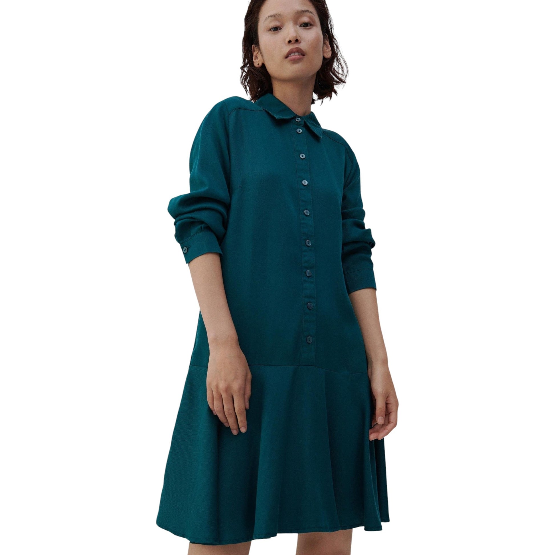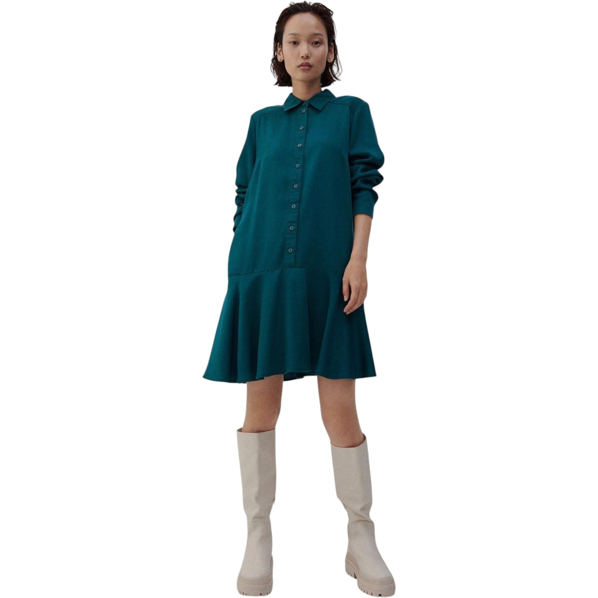 Címke nélküli, sötétzöld, hosszú ujjú, inggalléros, elöl gombos, mell alatt bővülő, fodros aljú mini ruha.
