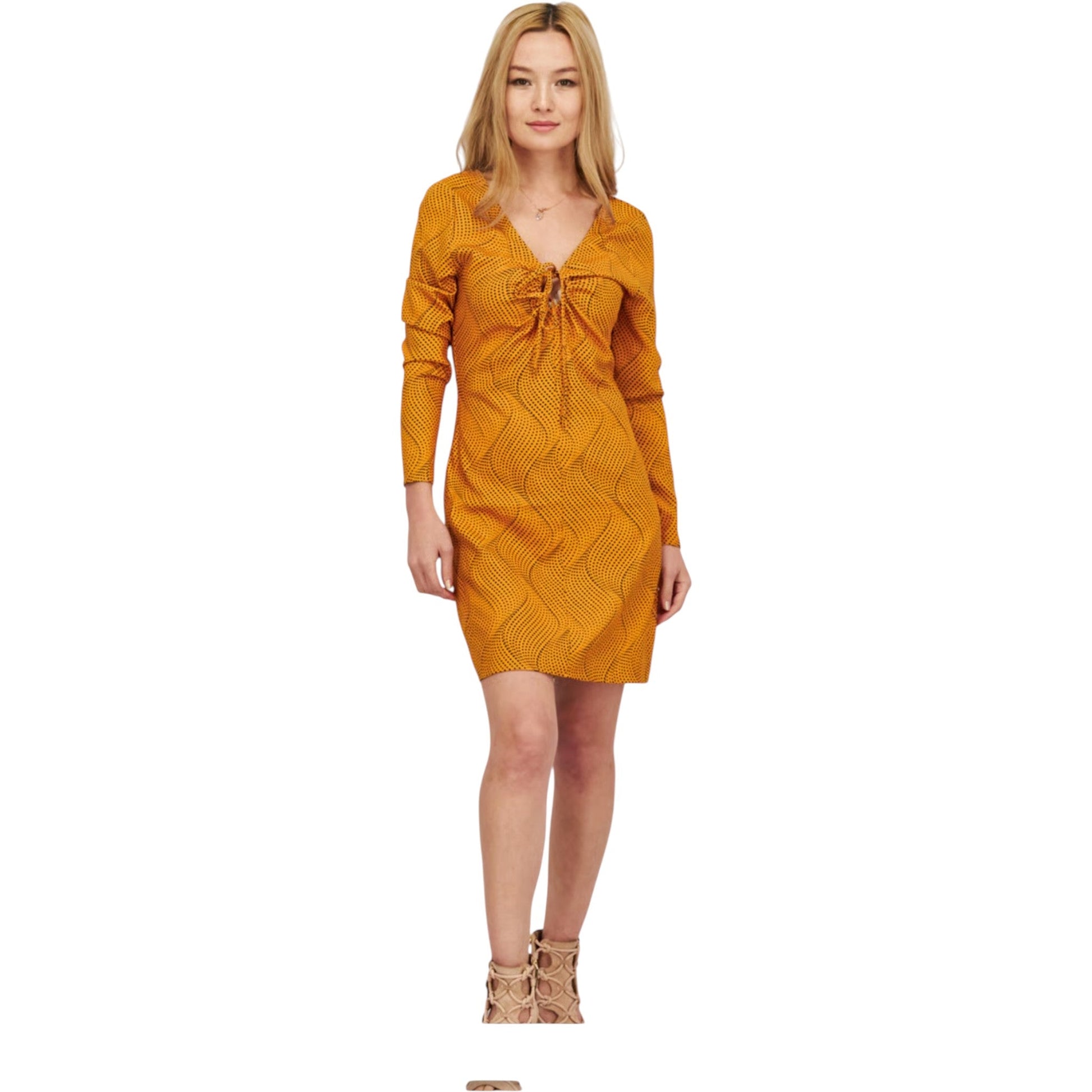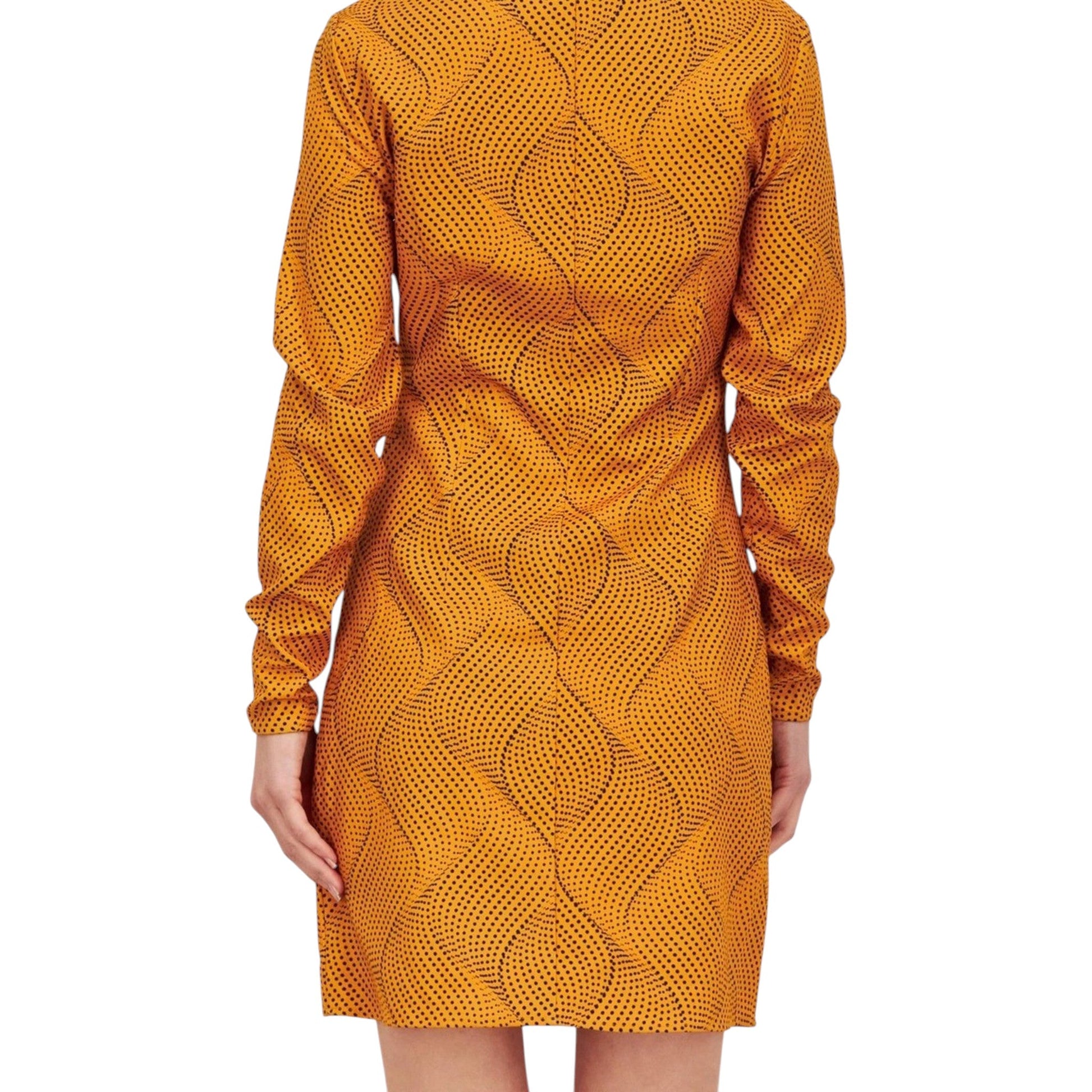 Címke nélküli, mustársárga alapon fekete hullámmintás, hosszú ujjú, V-nyakú, elöl nyakkivágásnál megköthető, A-vonalú mini ruha.
