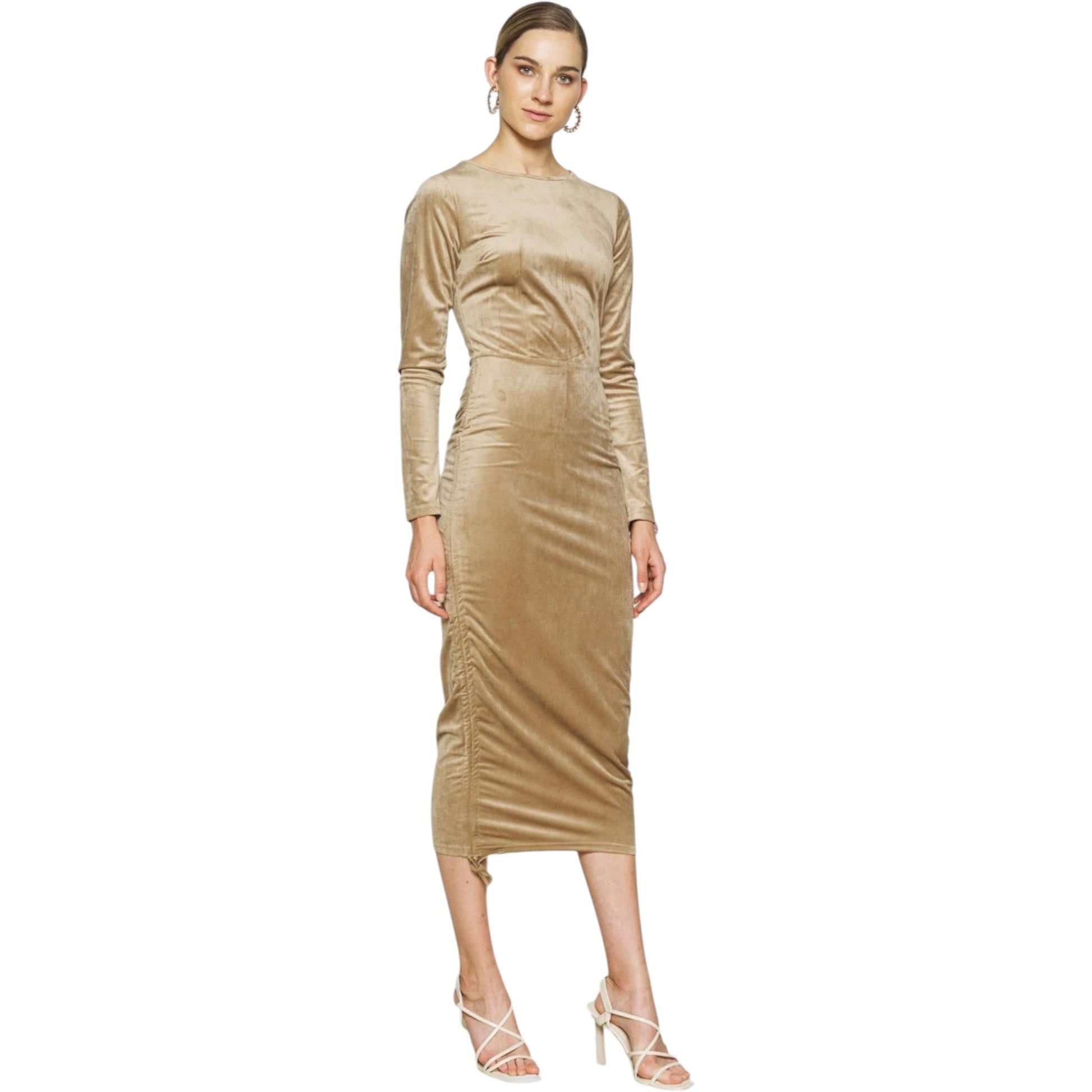 Címke nélküli, drapp, hosszú ujjú, bársony anyagú, oldalt húzott/ráncolt, testhezálló, ceruza fazonú midi ruha.