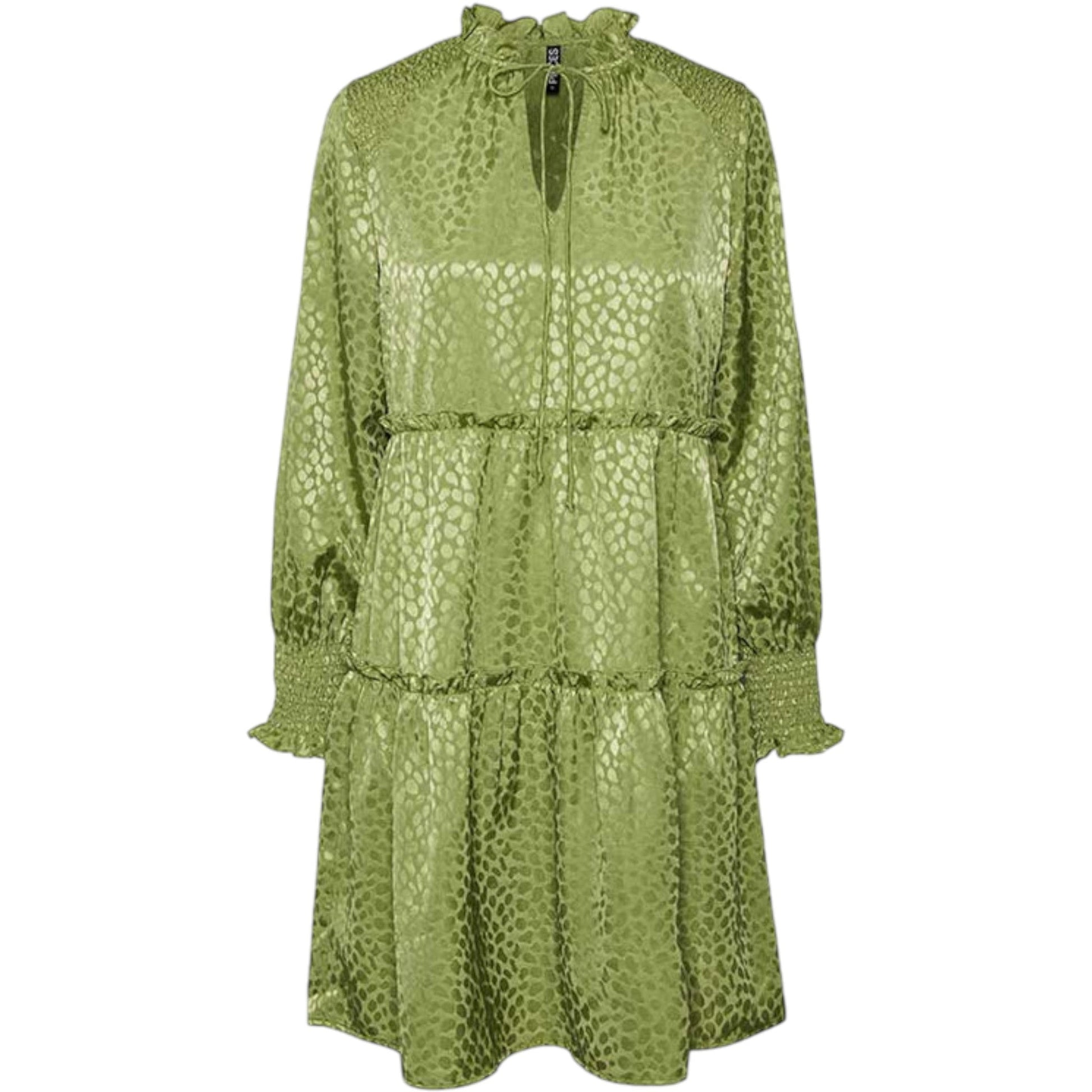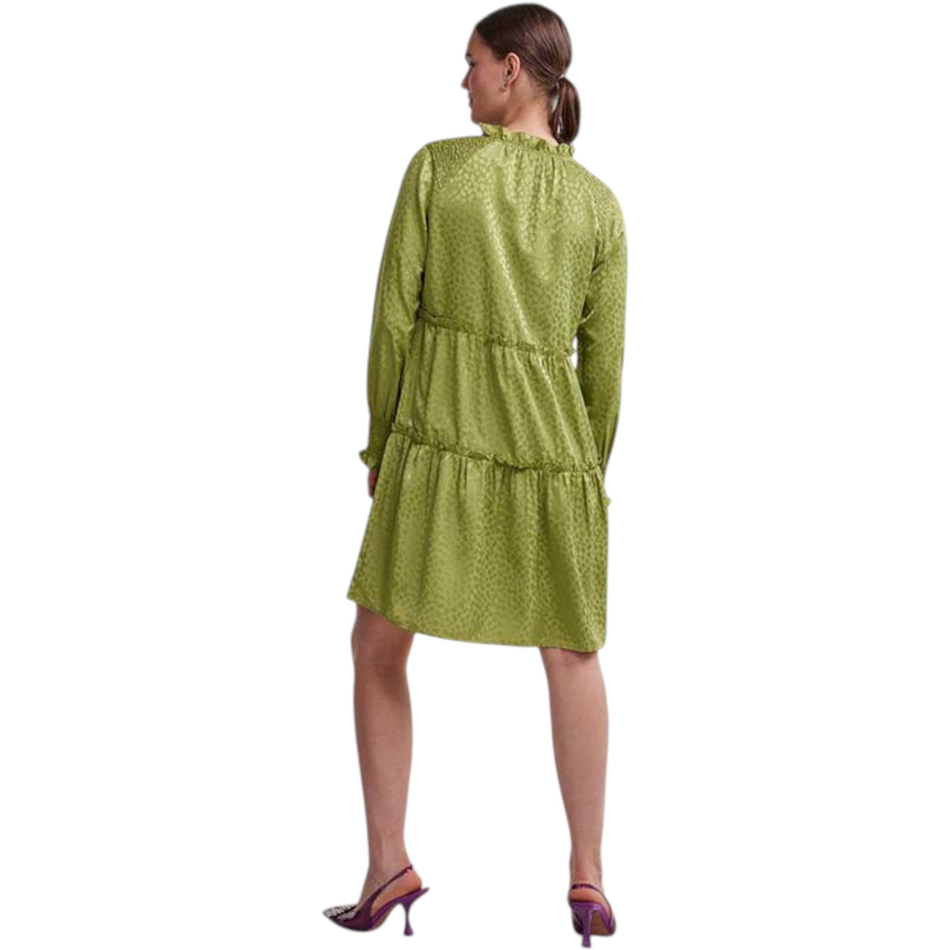 Címke nélküli, zöld, hosszú ujjú, enyhén fényes, apró mintás anyagból készült, fodros gallérú, derékban húzott, réteges szoknyás mini ruha.