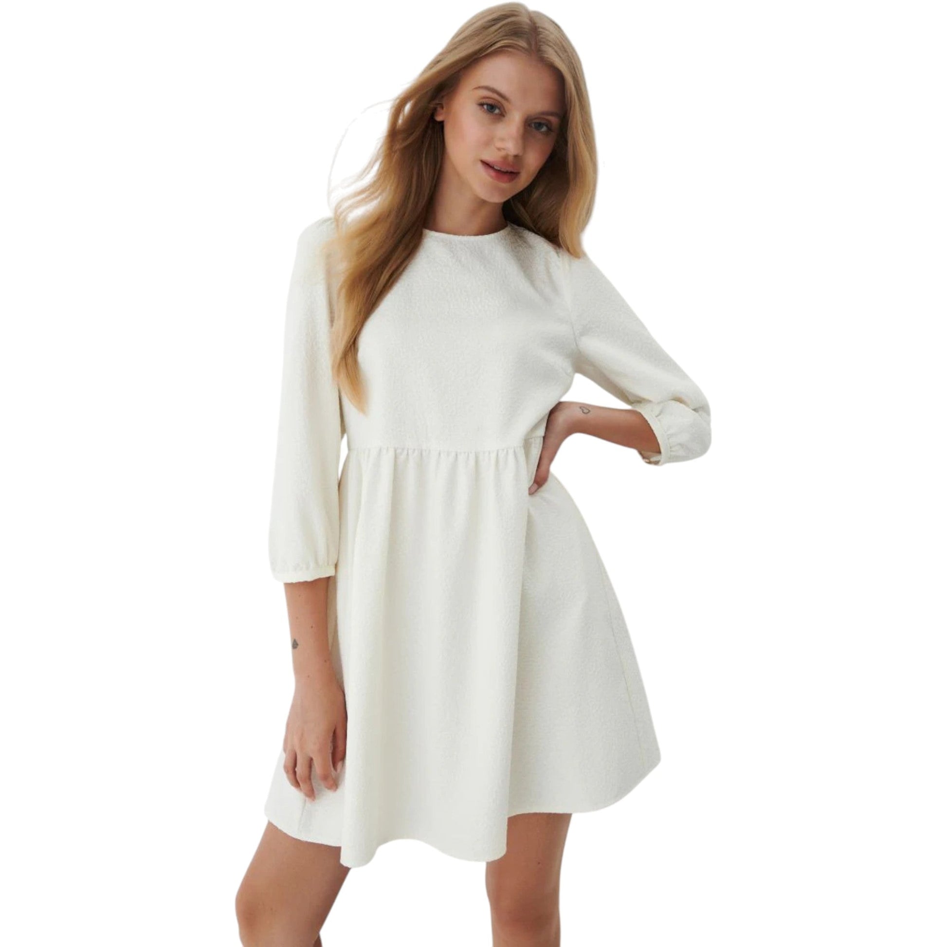 Címke nélküli, fehér, texturált anyagú (pl. bouclé/tweed hatású), kerek nyakú (hátul kulcslyuk kivágással és gombbal), háromnegyedes ujjú, A-vonalú mini ruha.
