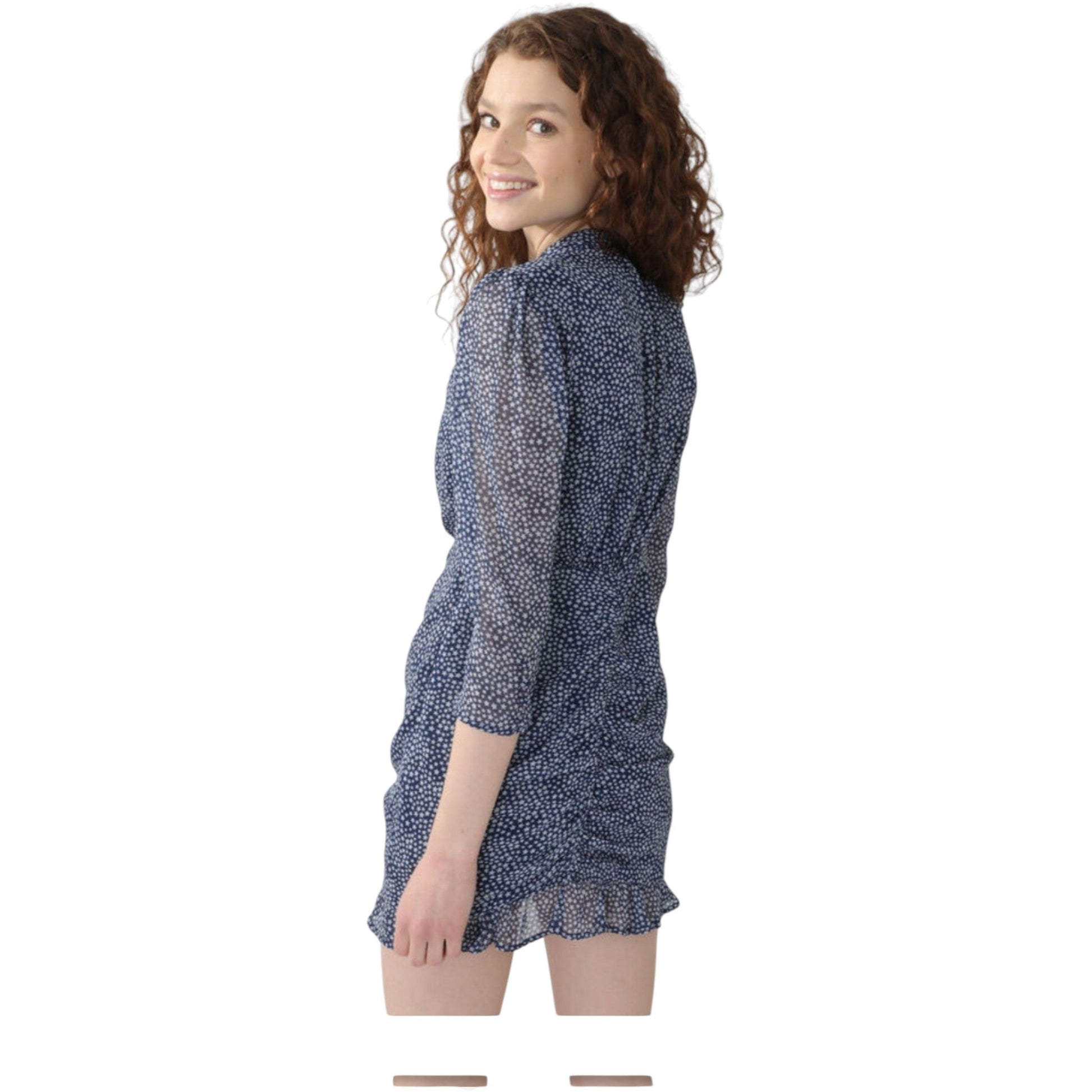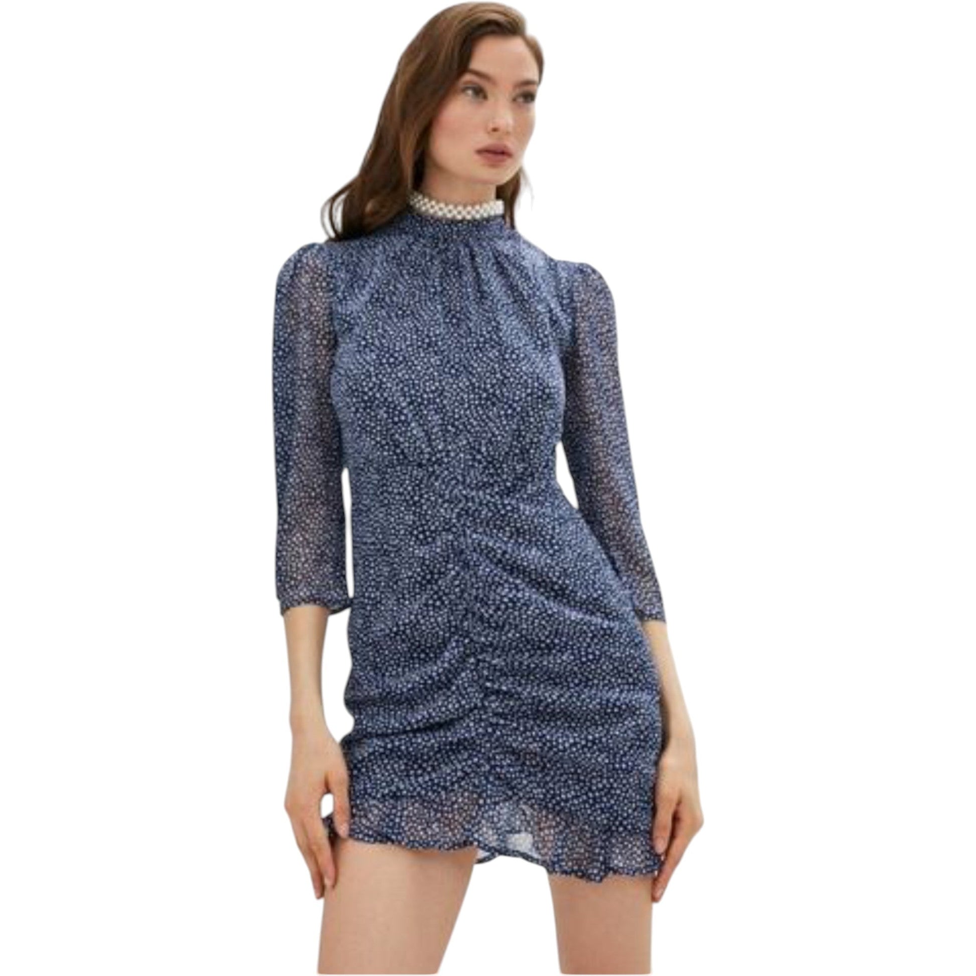 Címke nélküli, sötétkék és fehér pöttyös mintás, áttetsző anyagú, háromnegyedes ujjú, magas nyakú, elöl ráncolt, fodros szegélyű mini ruha.