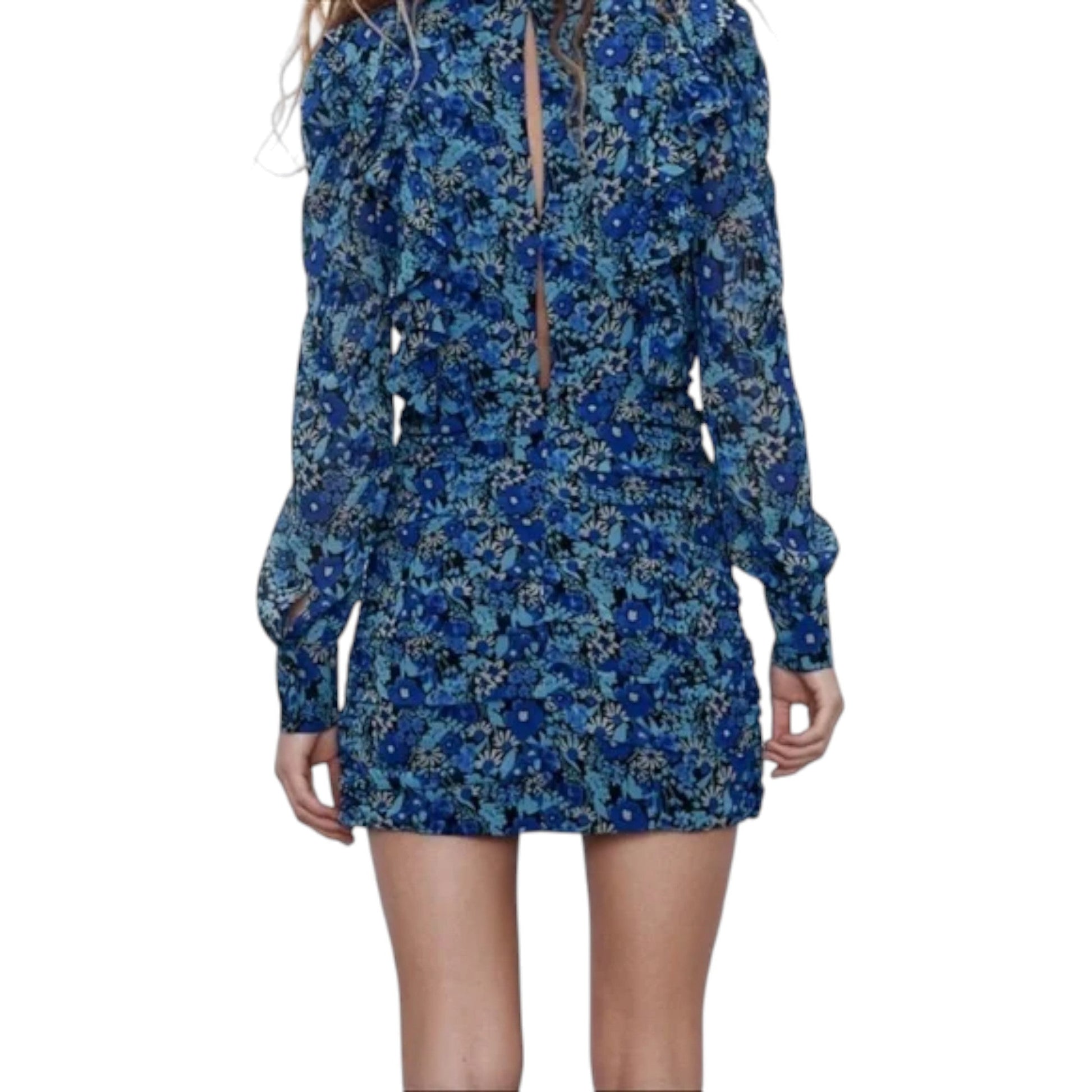 Címke nélküli, kék alapon több árnyalatú kék és fekete virágmintás, hosszú ujjú, kerek nyakú, vállán és a derekán fodros, derekán megkötős, rövid, mini ruha.