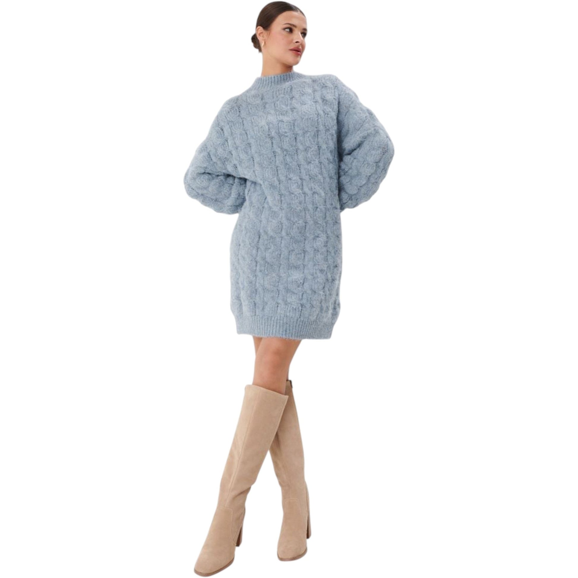 Címke nélküli, világoskék, hosszú ujjú, kerek nyakú, térdig érő, vastag, fonott mintás kötött pulóver ruha.
