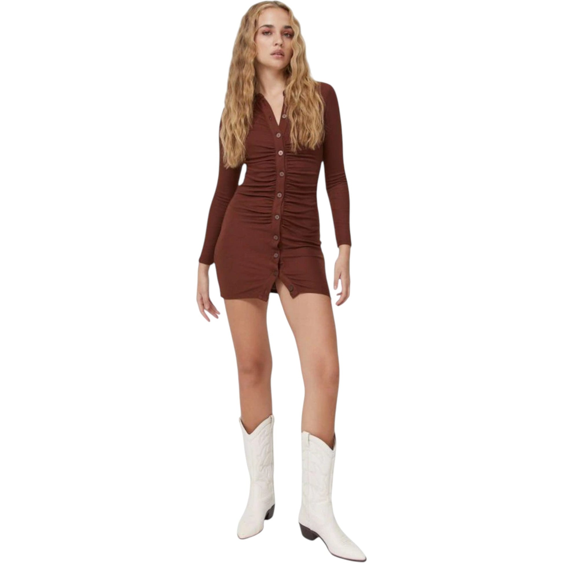Címke nélküli, barna, hosszú ujjú, kerek nyakú, derekán ráncolt, bordás kötött anyagú, testhezálló mini ruha.