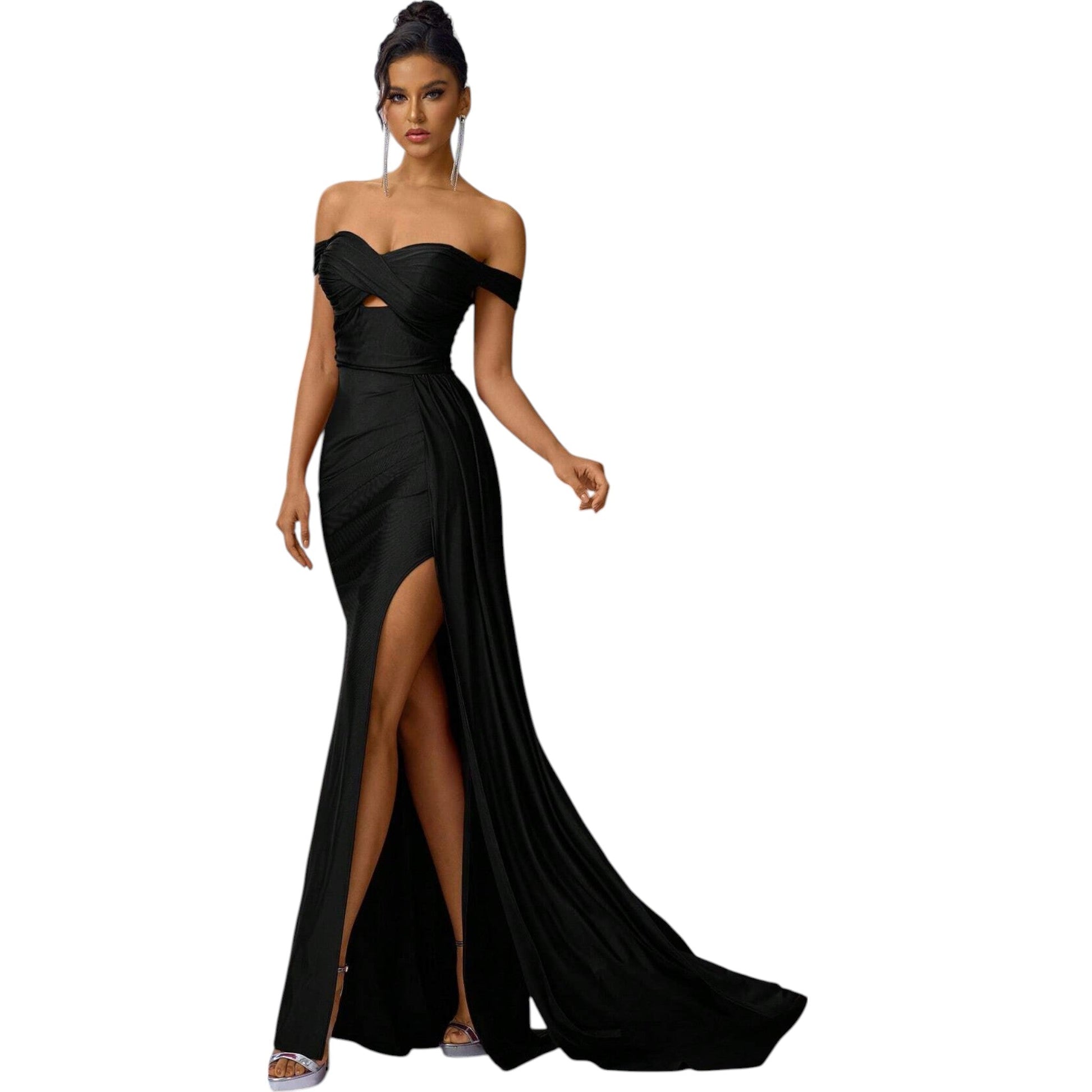 Címke nélküli, fekete, váll nélküli, szív alakú nyakkivágású, magas sliccelt estélyi ruha.