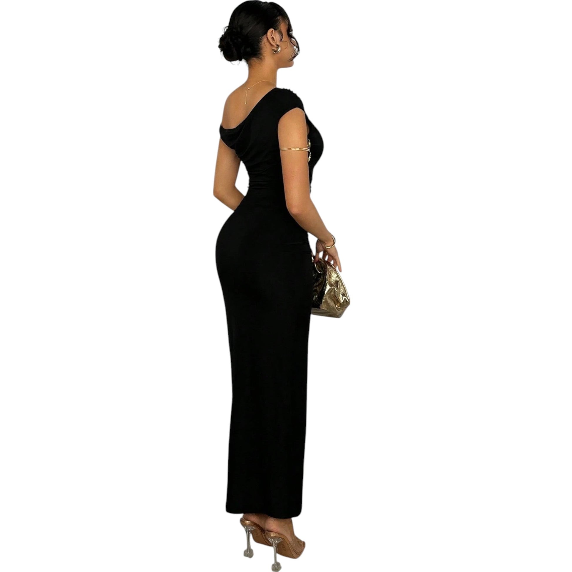 Címke nélküli, fekete, aszimmetrikus vállú, ráncolt, slim fit maxi ruha.