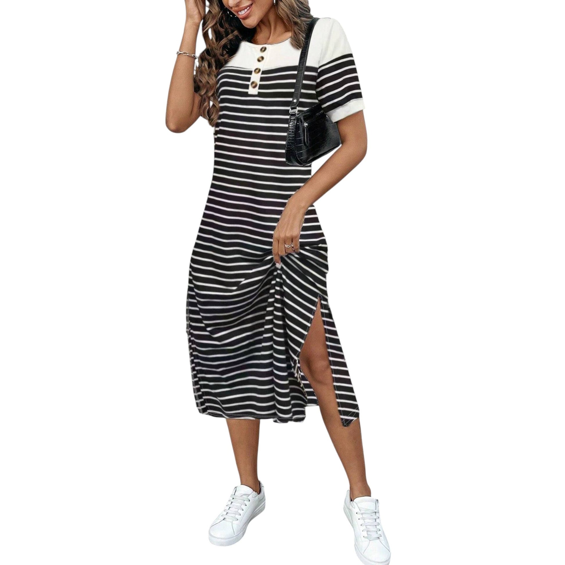 Címke nélküli, fekete-fehér csíkos, rövid ujjú, gombos, oldalt sliccelt midi ruha.