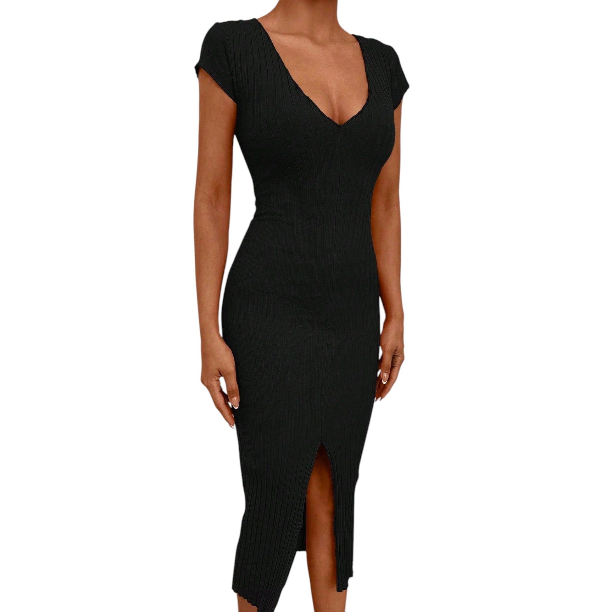 Címke nélküli, fekete, bordázott, rövid ujjú, V-nyakú, slim fit, elöl felsliccelt, midi ruha.