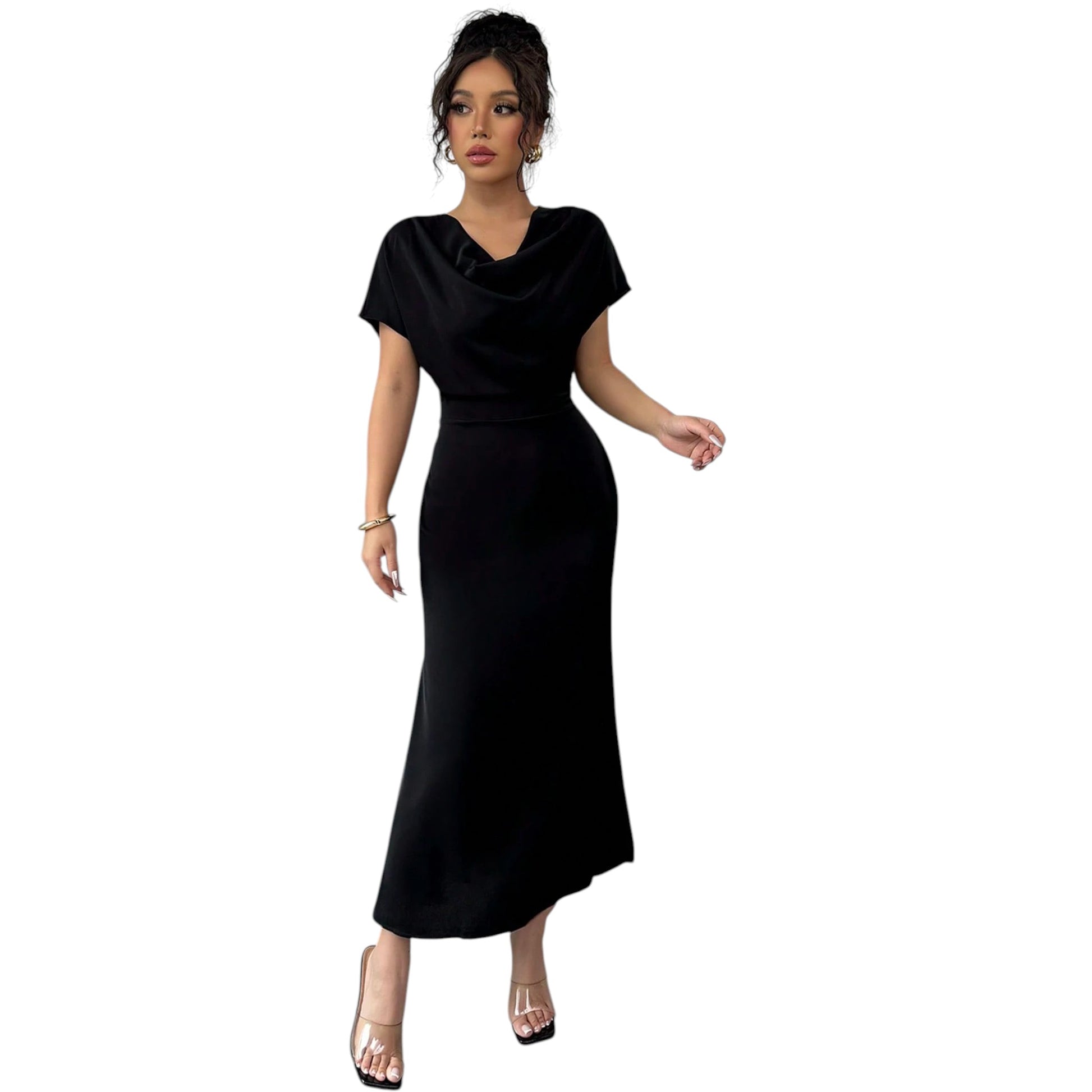 Címke nélküli, fekete, rövid ujjú, gallér nélküli, testhezálló midi ruha, nyitott hátú és elől redőzött nyakrésszel.