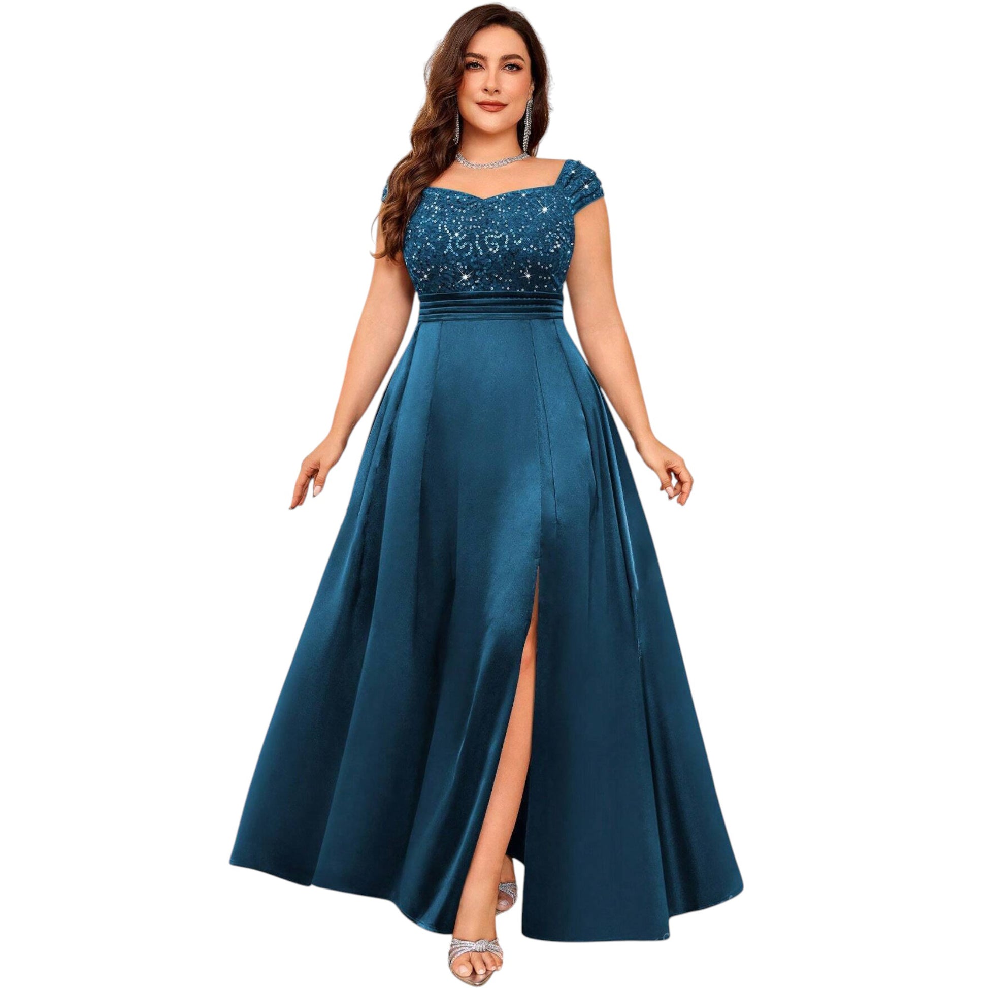 Címke nélküli, kék, V-nyakú, rövid ujjú, flitteres felsőrészű, felsliccelt szoknyás, maxi ruha.