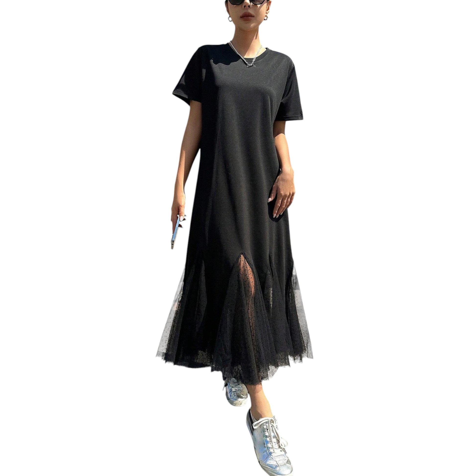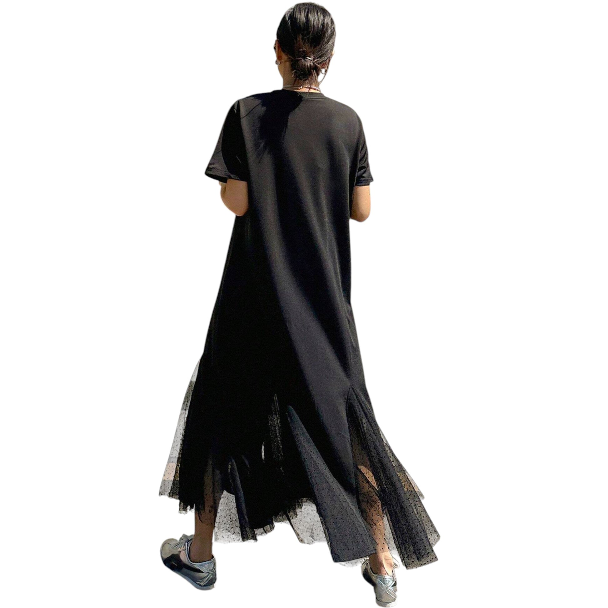 Címke nélküli, fekete, rövid ujjú, kerek nyakú, bő szabású ruha, bokáig érő hosszal és tüll alsó résszel.