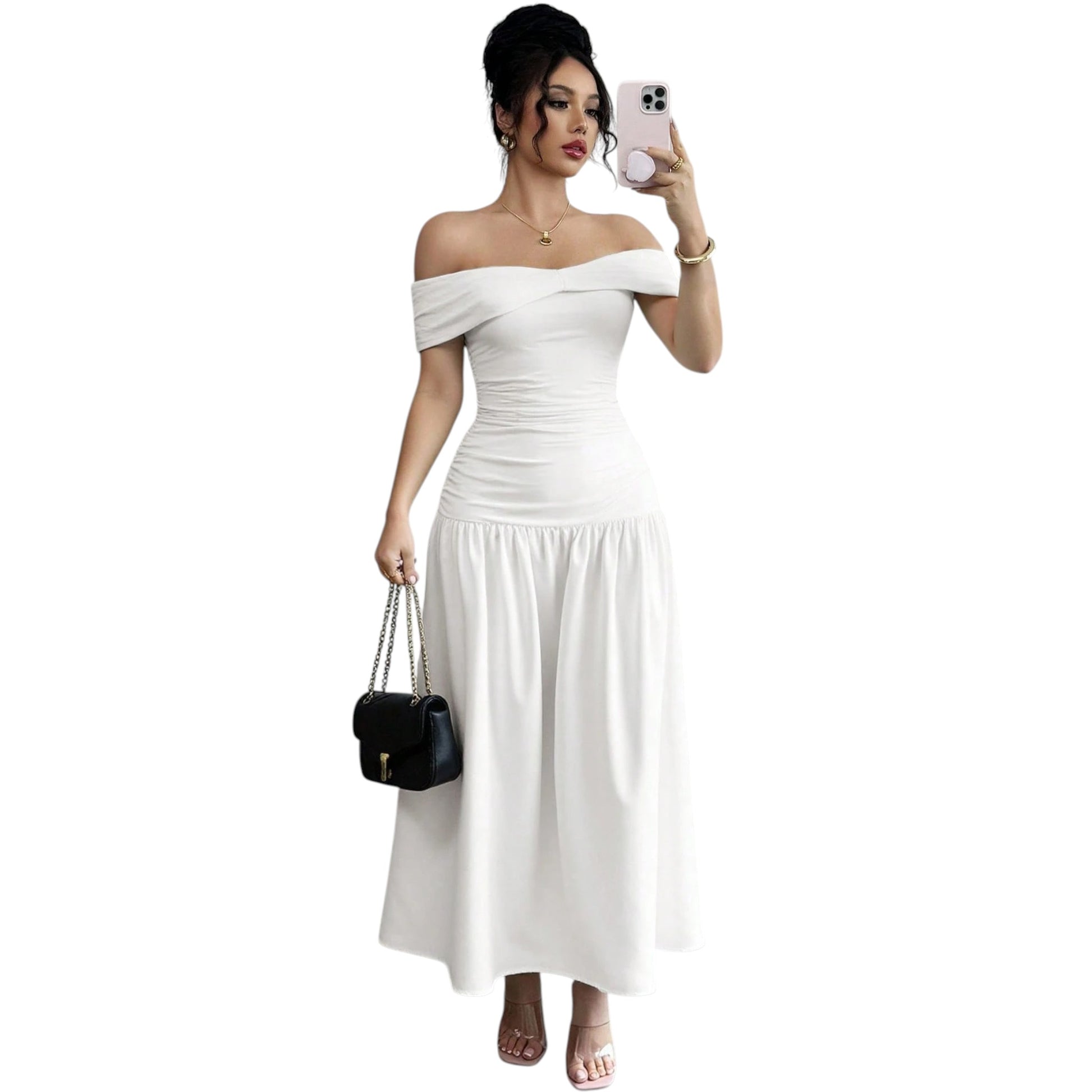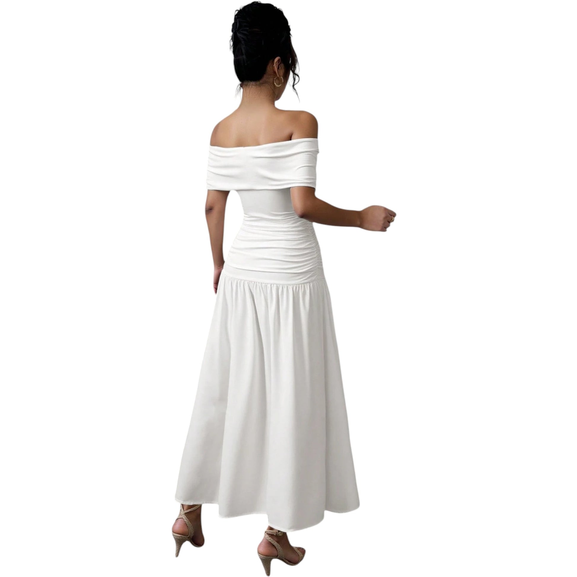 Címke nélküli, ekrü, spagetti pántos, váll nélküli, mellrésznél szűkített, húzott szoknyarészű, maxi ruha.