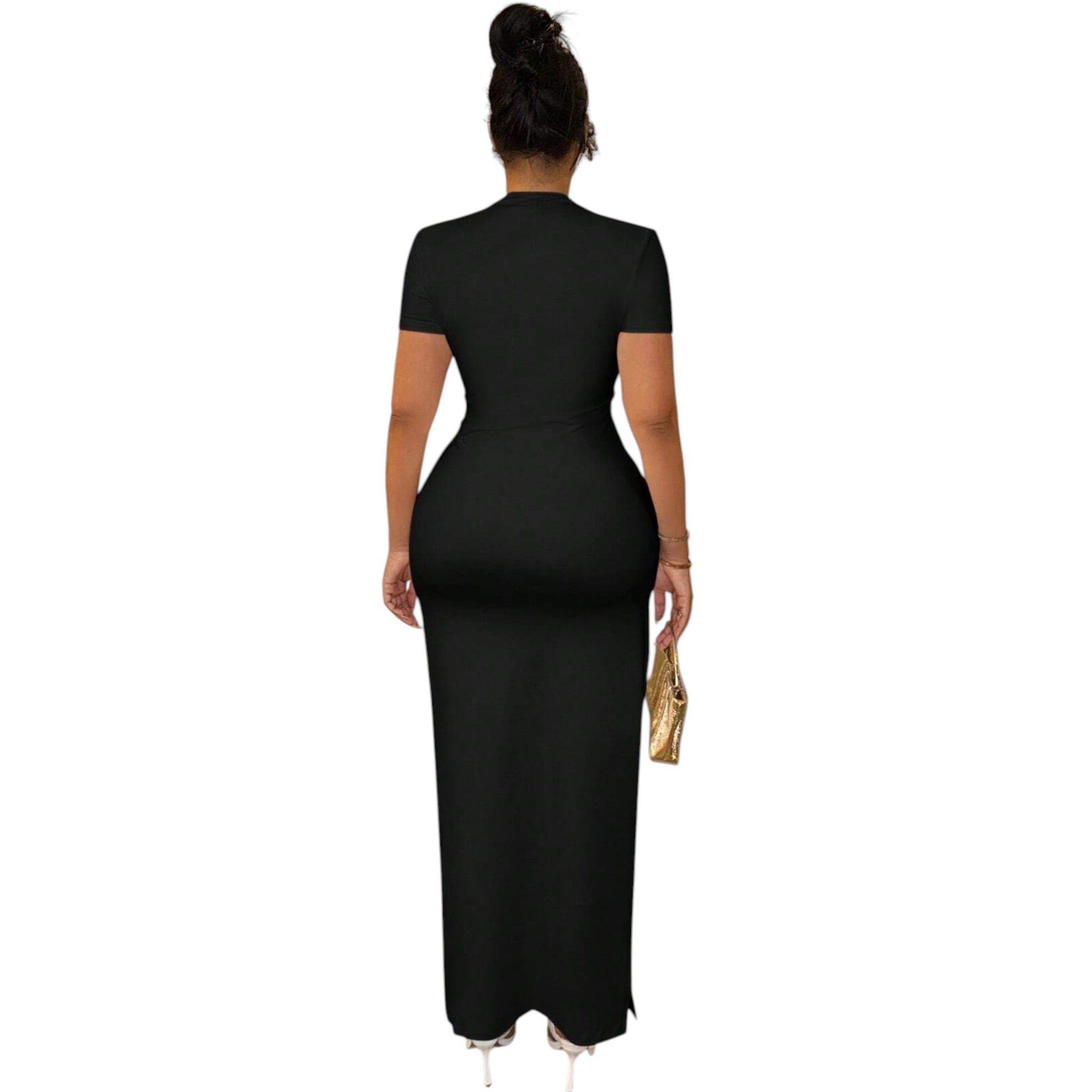 Címke nélküli, fekete, rövid ujjú, magas nyakú, hosszú ruha, elöl kivágással, testhezálló szabással, a szoknyán ráncolással és egy hasítékkal.