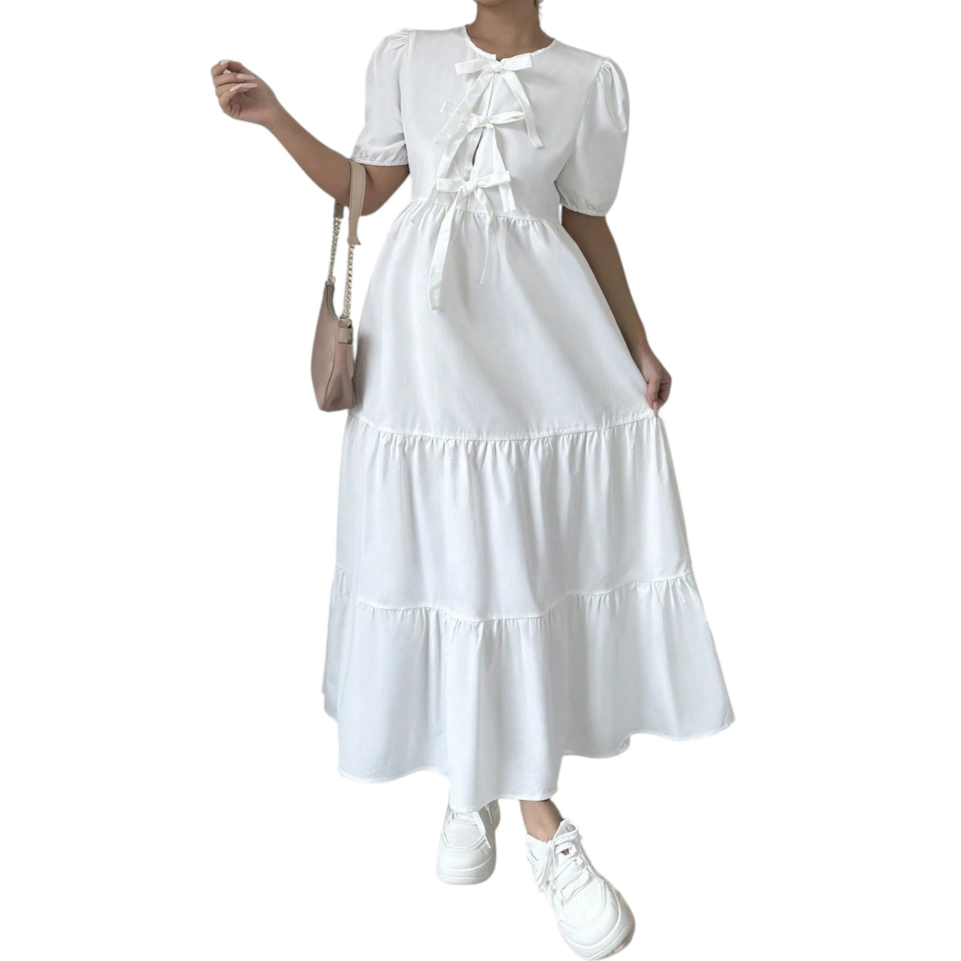 Címke nélküli, ekrü, rövid, puffos ujjú, V-nyakú, elöl megkötős, mell alatt húzott, fodros, maxi ruha.