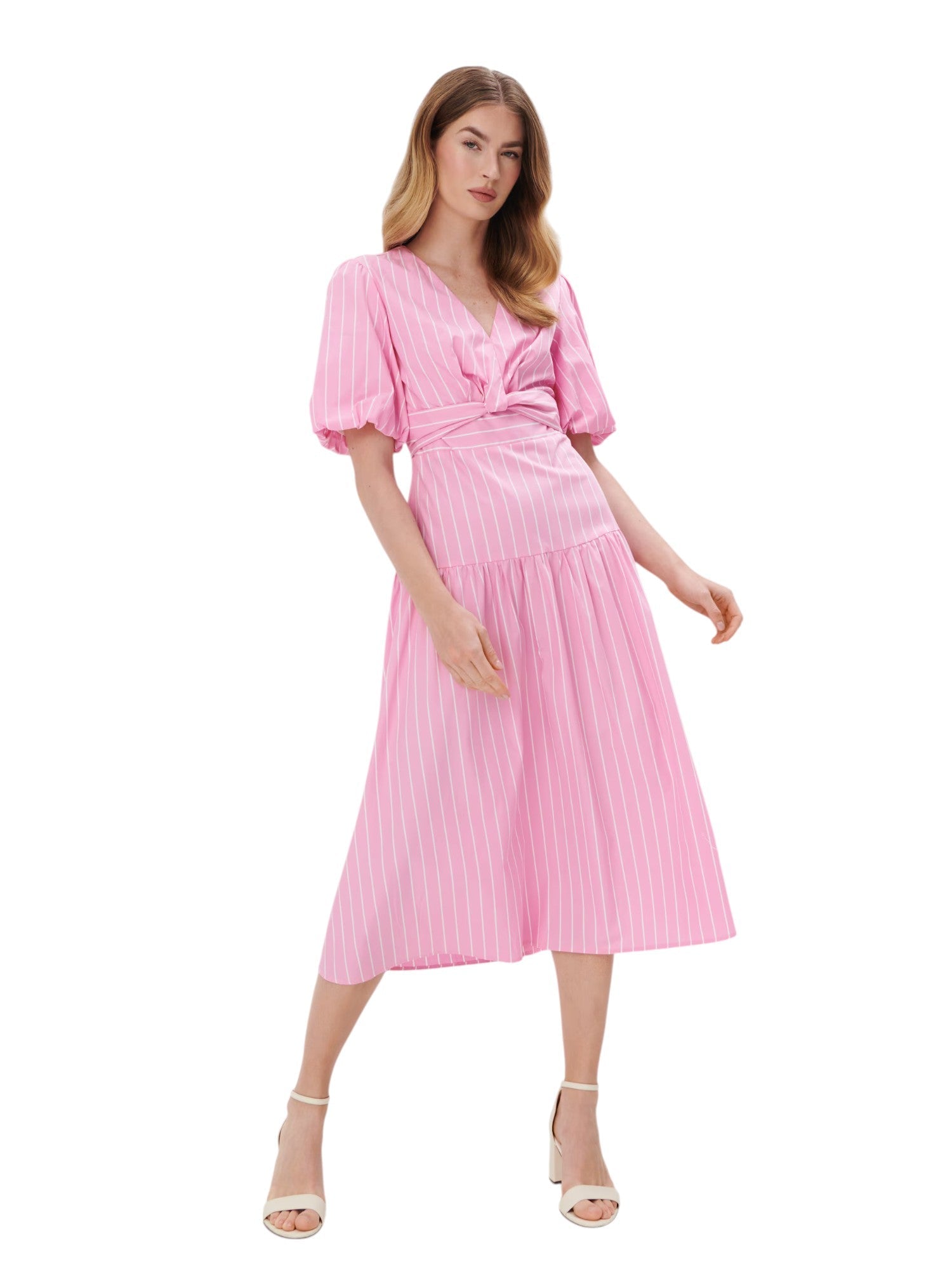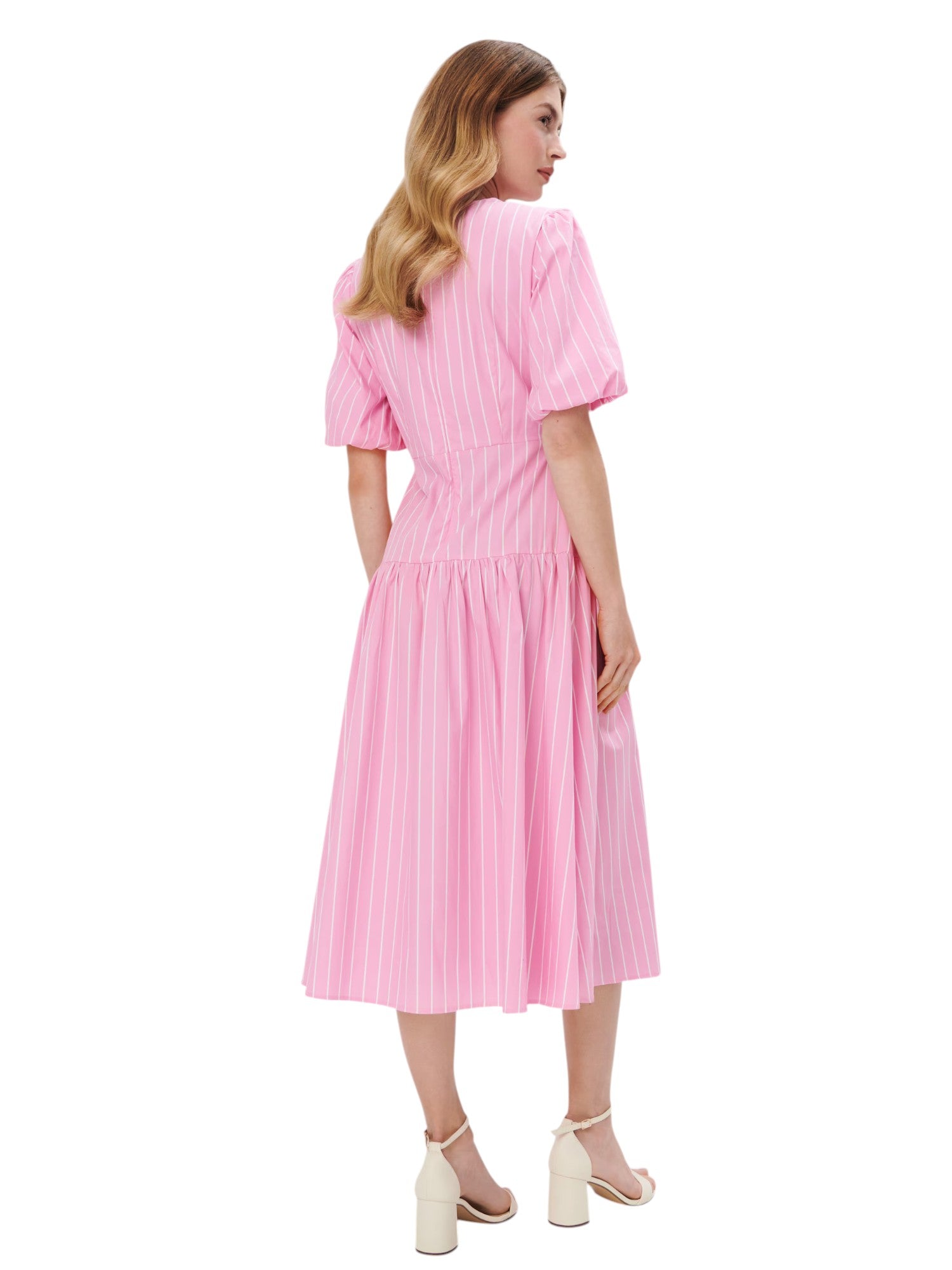 Címke nélküli, rózsaszín, fehér csíkos, rövid puffos ujjú, V-nyakú, megkötős derék, A-vonalú midi ruha