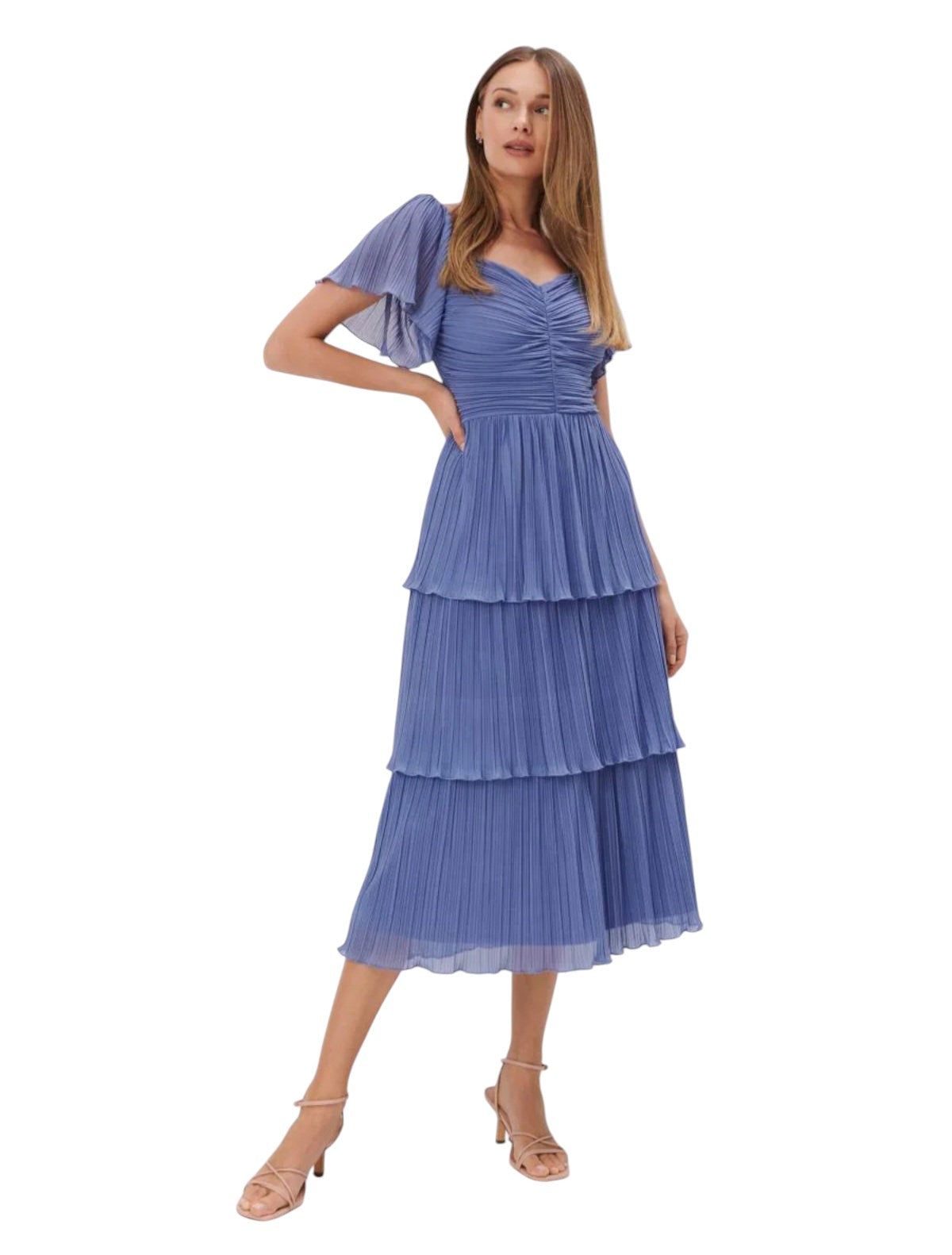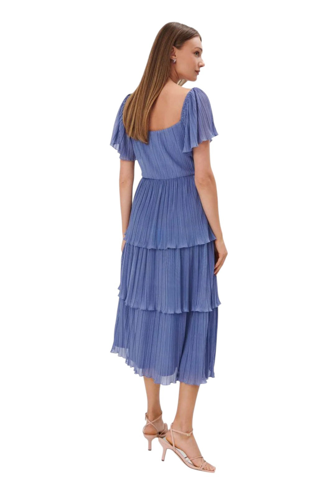 Címke nélküli, kék, rövid fodros ujjú, V-nyakú, ráncolt mellrész, többszintes, pliszírozott midi ruha