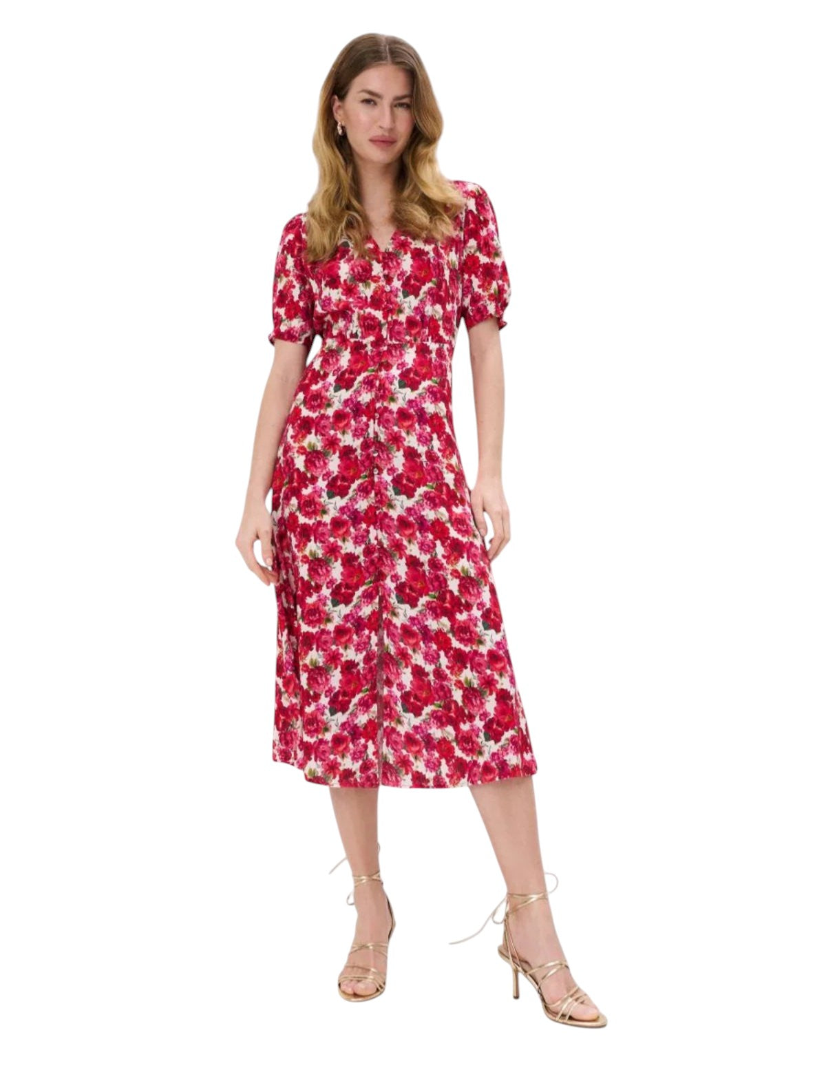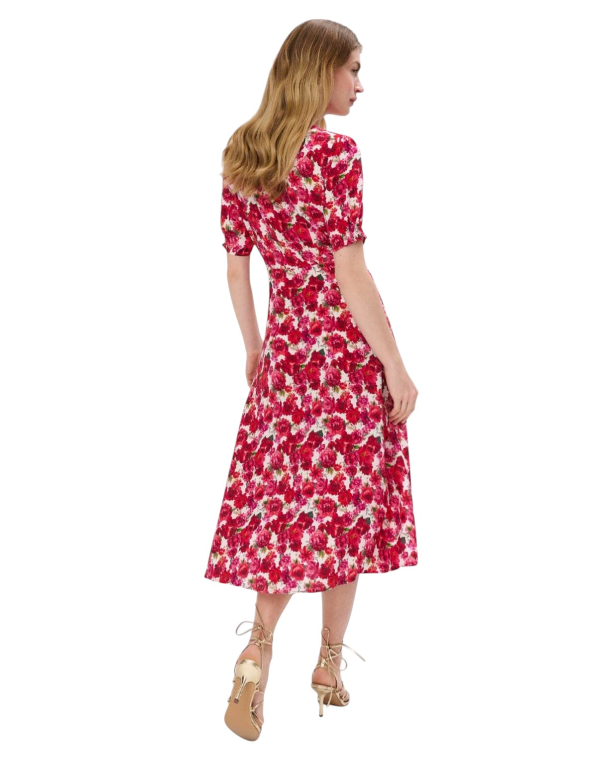 Címke nélküli, piros, fehér és zöld rózsamintás, rövid ujjú, V-nyakú, gombos, A-vonalú midi ruha